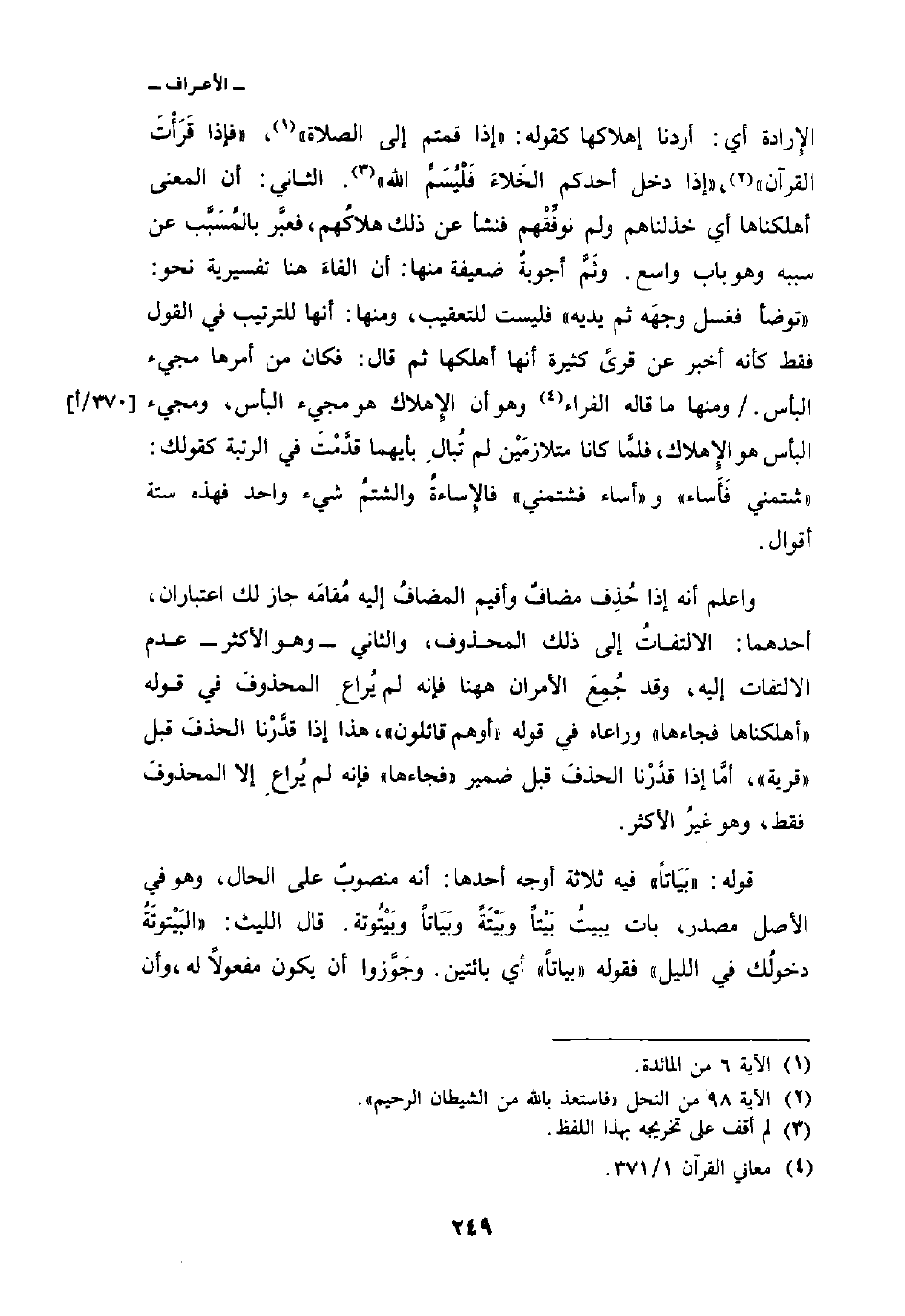الثاني: أن المعنى أهلكناها أي خذلناهم ولم نوفِّقْهم فنشأ عن ذلك هلاكُهم، فعبَّر بالمُسَبَّب عن سببه وهو باب واسع. وثَمَّ أجوبةٌ ضعيفة منها: أن الفاءَ هنا تفسيرية نحو: «توضأ فغسل وجهَه ثم يديه» فليست للتعقيب، ومنها: أنها للترتيب في القول فقط كأنه أخبر عن قرىً كثيرة أنها أهلكها ثم قال: فكان من أمرها مجيء البأس. / ومنها ما قاله الفراء وهو أن الإِهلاك هو مجيء البأس، ومجيء البأس هو الإِهلاك، فلمَّا كانا متلازمَيْن لم تُبالِ بأيهما قدَّمْتَ في الرتبة كقولك: «شتمني فَأَساء» و «أساء فشتمني» فالإِساءةُ والشتمُ شيء واحد فهذه ستة أقوال.