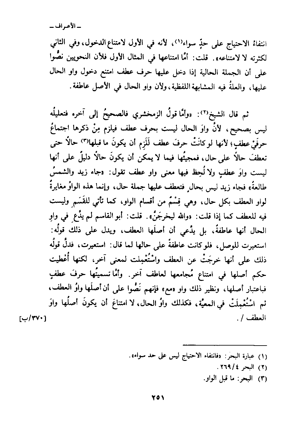 انتفاءُ الاحتياج على حدٍّ سواء، لأنه في الأول لامتناع الدخول، وفي الثاني لكثرته لا لامتناعه «. قلت: أمَّا امتناعها في المثال الأول فلأن النحويين نصُّوا على أن الجملة الحالية إذا دخل عليها حرف عطف امتنع دخول واو الحال عليها، والعلةُ فيه المشابهة اللفظية، ولأن واو الحال في الأصل عاطفة.