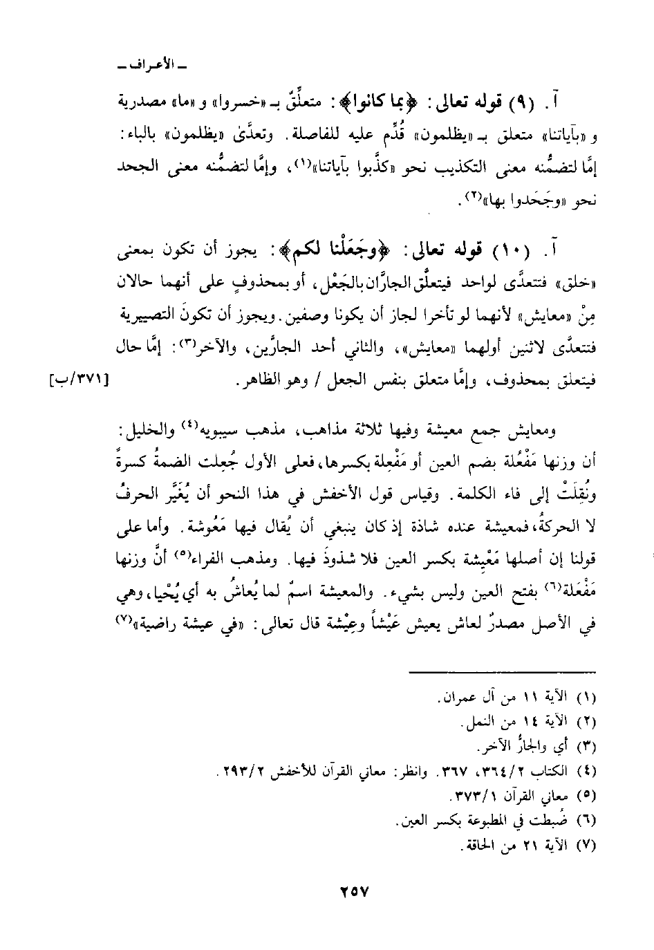 ومعايش جمع معيشة وفيها ثلاثة مذاهب، مذهب سيبويه والخليل: أن وزنها مَفْعُلة بضم العين أو مَفْعِلة بكسرها، فعلى الأول جُعِلت الضمةُ كسرةً ونُقِلَتْ إلى فاء الكلمة. وقياس قول الأخفش في هذا النحو أن يُغَيَّر الحرفُ لا الحركةُ، فمعيشة عنده شاذة إذ كان ينبغي أن يُقال فيها مَعُوشة. وأما على قولنا إن أصلها مَعْيِشة بكسر العين فلا شذوذَ فيها. ومذهب الفراء أنَّ وزنها مَفْعَلة بفتح العين وليس بشيء. والمعيشة اسمٌ لما يُعاشُ به أي يُحْيا، وهي في الأصل مصدرٌ لعاش يعيش عَيْشاً وعِيْشة قال تعالى: {فِي عِيشَةٍ رَّاضِيَةٍ} [الحاقة: 21]