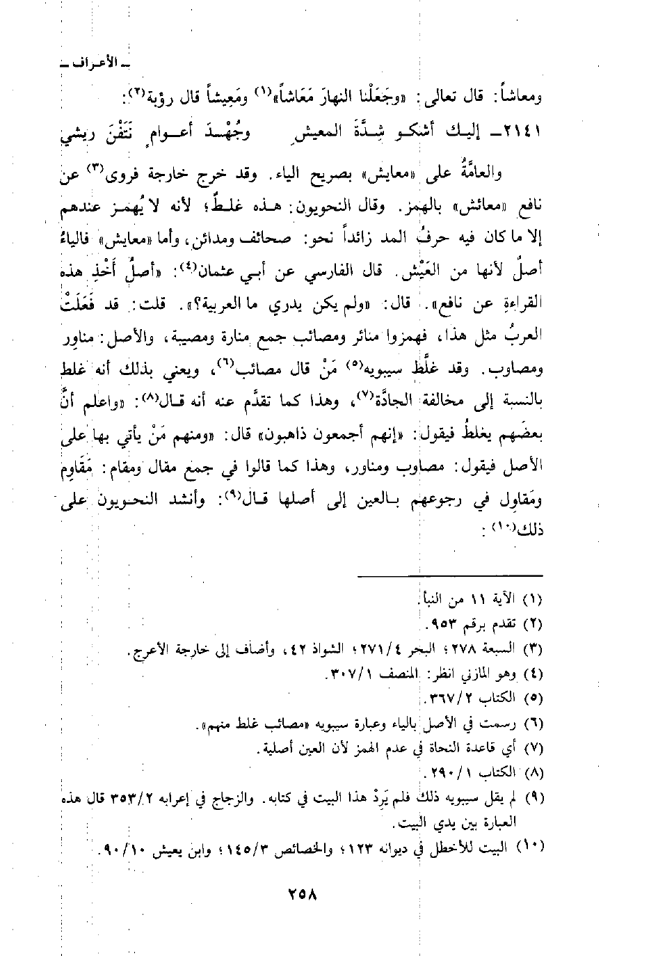 والعامَّةُ على «معايش» بصريح الياء. وقد خرج خارجة فروى عن نافع «معائش» بالهمز. وقال النحويون: هذه غلطٌ؛ لأنه لا يُهمز عندهم إلا ما كان فيه حرفُ المد زائداً نحو: صحائف ومدائن، وأما «معايش» فالياءُ أصلٌ لأنها من العَيْش. قال الفارسي عن أبي عثمان: «أصلُ أَخْذِ هذه القراءةِ عن نافع» . قال: «ولم يكن يدري ما العربية؟» . قلت: قد فَعَلَتْ العربُ مثل هذا، فهمزوا منائر ومصائب جمع منارة ومصيبة، والأصل: مناوِر ومصاوب. وقد غلَّط سيبويه مَنْ قال مصائب، ويعني بذلك أنه غلط بالنسبة إلى مخالفة الجادَّة، وهذا كما تقدَّم عنه أنه قال: «واعلم أنَّ بعضَهم يغلطُ فيقول:» إنهم أجمعون ذاهبون «قال:» ومنهم مَنْ يأتي بها على الأصل فيقول: مصاوب ومناور، وهذا كما قالوا في جمع مقال ومقام: مَقَاوِم ومَقاوِل في رجوعهم بالعين إلى أصلها قال: وأنشد النحويون على ذلك: