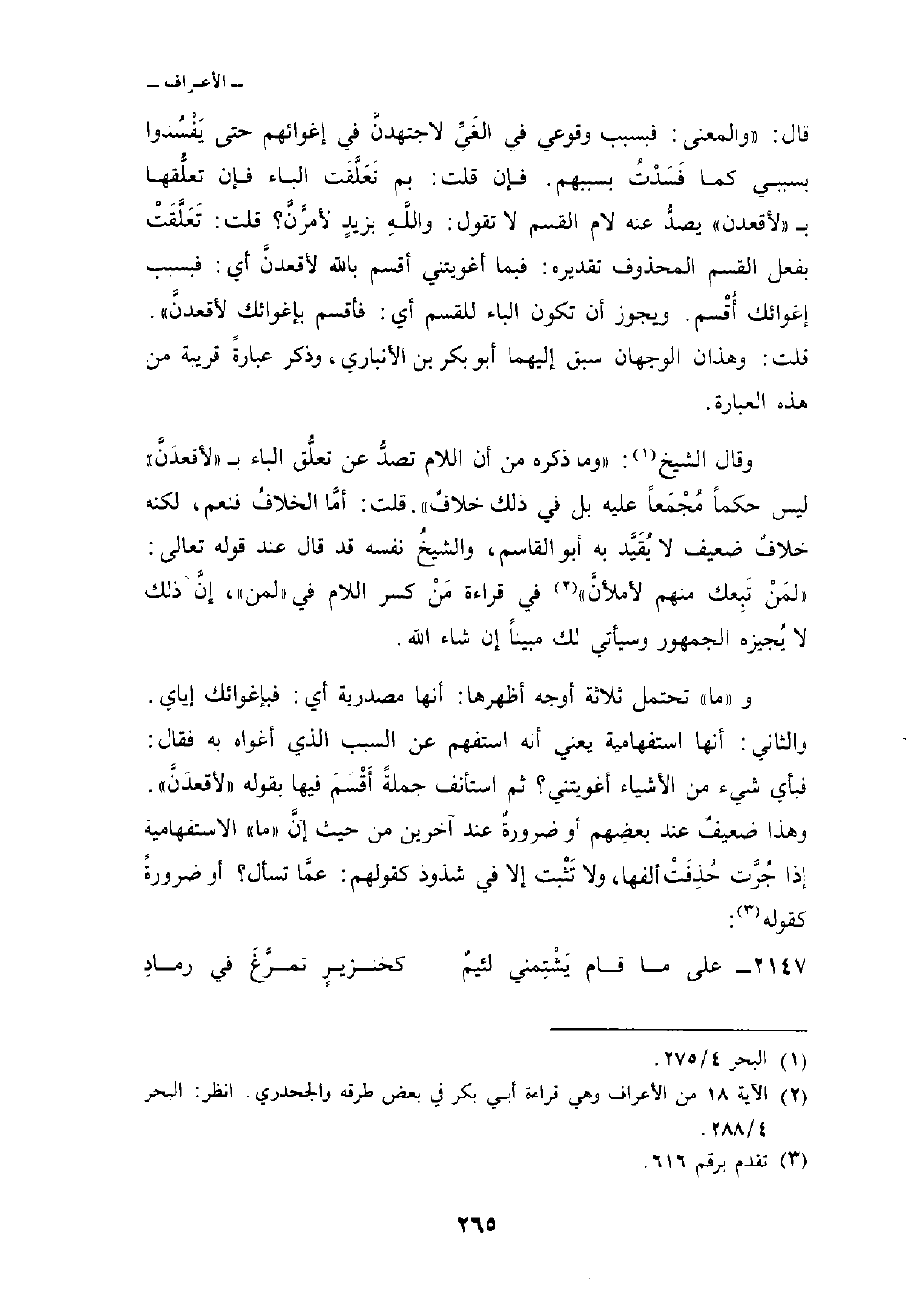 قال: «والمعنى: فبسبب وقوعي في الغَيِّ لاجتهدنّ في إغوائهم حتى يَفْسُدوا بسببي كما فَسَدْتُ بسببهم. فإن قلت: بم تَعَلَّقَت الباء فإن تعلُّقها ب» لأقعدن «يصدُّ عنه لام القسم لا تقول: واللهِ بزيدٍ لأمرَّنَّ؟ قلت: تَعَلَّقَتْ بفعل القسم المحذوف تقديره: فبما أغويتني أقسم بالله لأقعدنَّ أي: فبسبب إغوائك أُقْسم. ويجوز أن تكون الباء للقسم أي: فأقسم بإغوائك لأقعدنَّ» . قلت: وهذان الوجهان سبق إليهما أبو بكر بن الأنباري، وذكر عبارةً قريبة من هذه العبارة.