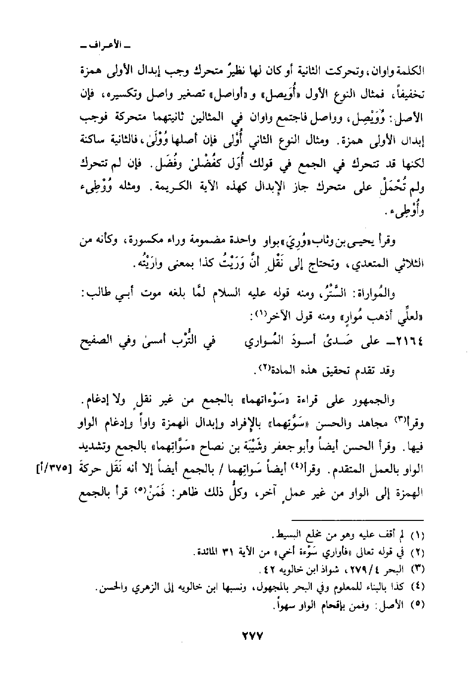 الكلمة واوان، وتحركت الثانية أو كان لها نظيرٌ متحرك وجب إبدال الأولى همزة تخفيفاً، فمثال النوع الأول «أُوَيصل» و «أواصل» تصغير واصل وتكسيره، فإن الأصل: وُوَيْصِل، وواصل فاجتمع واوان في المثالين ثانيتهما متحركة فوجب إبدال الأولى همزة. ومثال النوع الثاني أُوْلى فإن أصلها وُوْلَى، فالثانية ساكنة لكنها قد تتحرك في الجمع في قولك أُوَل كفُضْلى وفُضَل. فإن لم تتحرك ولم تُحْمَلْ على متحرك جاز الإِبدال كهذه الآية الكريمة. ومثله وُوْطِئ وأُوْطِئ.