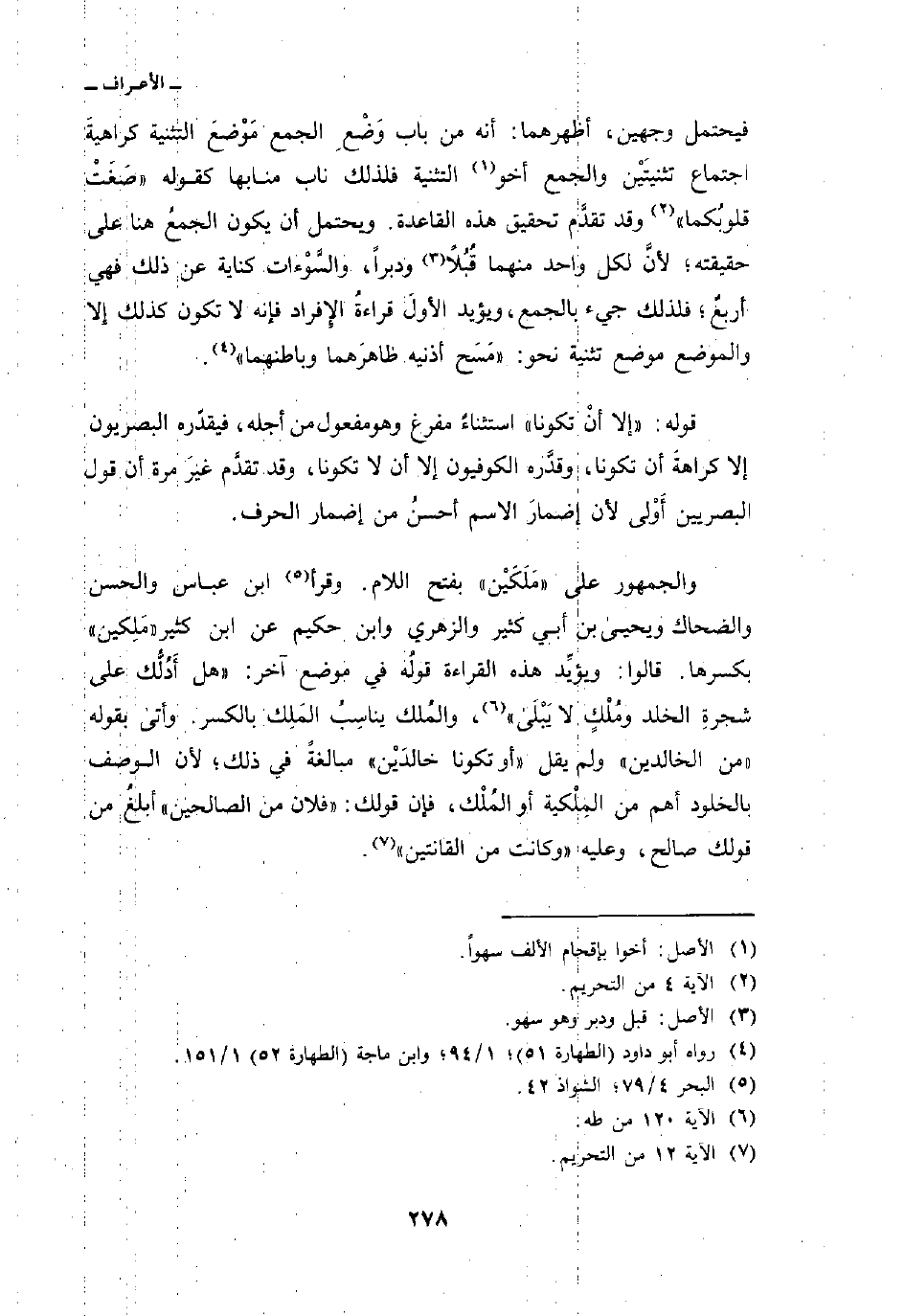 والجمهور على «مَلَكَيْن» بفتح اللام. وقرأ ابن عباس والحسن والضحاك ويحيى بن أبي كثير والزهري وابن حكيم عن ابن كثير «مَلِكين» بكسرها. قالوا: ويؤيِّد هذه القراءة قولُه في موضع آخر: {هَلْ أَدُلُّكَ على شَجَرَةِ الخلد وَمُلْكٍ لاَّ يبلى} [طه: 120] والمُلك يناسِبُ المَلِك بالكسر. وأتى بقوله «من الخالدين» ولم يقل «أو تكونا خالدَيْن» مبالغةً في ذلك؛ لأن الوصف بالخلود أهم من المِلْكية أو المُلْك، فإن قولك: «فلان من الصالحين» أبلغُ من قولك صالح، وعليه {وَكَانَتْ مِنَ القانتين} [التحريم: 12] .