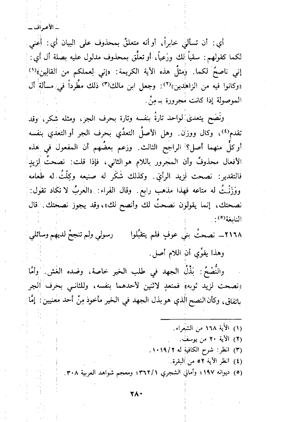 ونَصَح يتعدى لواحد تارةً بنفسه وتارة بحرف الجر، ومثله شكر، وقد تقدم، وكال ووزن. وهل الأصلُ التعدِّي بحرف الجر أو التعدي بنفسه أو كلٌّ منهما أصل؟ الراجح الثالث. وزعم بعضُهم أن المفعول في هذه الأفعال محذوفٌ وأن المجرور باللام هو الثاني، فإذا قلت: نصحتُ لزيدٍ فالتقدير: نصحت لزيد الرأيَ. وكذلك شَكَر له صنيعه وكِلْتُ له طعامه ووَزَنْتُ له متاعه فهذا مذهب رابع. وقال الفراء: «العربُ لا تكاد تقول: نصحتك، إنما يقولون نصحتُ لك وأنصح لك» ، وقد يجوز نصحتك. قال النابغة: