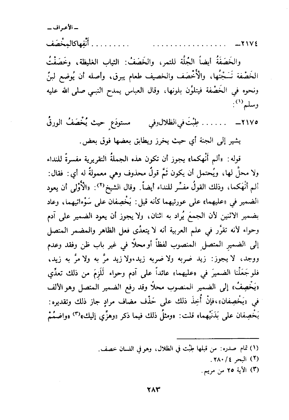 قوله: {أَلَمْ أَنْهَكُمَا} يجوز أن تكون هذه الجملةُ التقريرية مفسرةً للنداء ولا محلَّ لها، ويُحتمل أن يكون ثَمَّ قولٌ محذوف وهي معمولةٌ له أي: فقال: ألم أنْهَكما، وذلك القولُ مفسِّر للنداء أيضاً. وقال الشيخ: «الأَوْلى أن يعود الضمير في» عليهما «على عورتيهما كأنه قيل: يَخْصِفان على سَوْءاتيهما، وعاد بضمير الاثنين لأن الجمعَ يُراد به اثنان، ولا يجوز أن يعود الضمير على آدم وحواء لأنه تقرَّر في علم العربية أنه لا يتعدَّى فعل الظاهر والمضمر المتصل إلى الضميرِ المتصلِ المنصوب لفظاً أو محلاً في غير باب ظن وفقد وعدم ووجد، لا يجوز: زيد ضربه ولا ضربه زيد، ولا زيد مرَّ به ولا مرَّ به زيد، فلو جَعَلْنا الضميرَ في» عليهما «عائداً على آدم وحواء لَلَزِمَ من ذلك تعدِّي» يَخْصِفُ «إلى الضمير المنصوب محلاً وقد رفع الضمير المتصل وهو الألف في» يَخْصِفان «، فإنْ أُخِذَ ذلك على حَذْف مضاف مرادٍ جاز ذلك وتقديره:» يَخْصِفان على بَدَنَيْهما «، قلت: ومثلُ ذلك فيما ذكر
