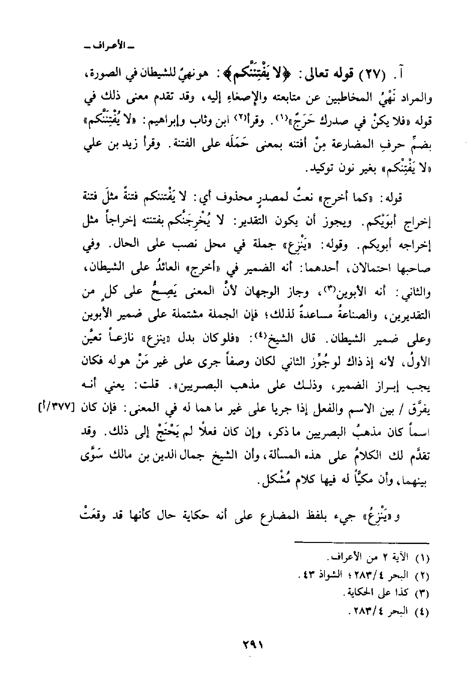 قوله تعالى: {لاَ يَفْتِنَنَّكُمُ} : هو نهيٌ للشيطان في الصورة، والمراد نَهْيُ المخاطبين عن متابعته والإِصغاءِ إليه، وقد تقدم معنى ذلك في قوله {فَلاَ يَكُنْ فِي صَدْرِكَ حَرَجٌ} [الأعراف: 2] . وقرأ ابن وثاب وإبراهيم: «لا يُفْتِنَنَّكم» بضمِّ حرفِ المضارعة مِنْ أفتنه بمعنى حَمَلَه على الفتنة. وقرأ زيد بن علي «لا يَفْتِنْكم» بغير نون توكيد.