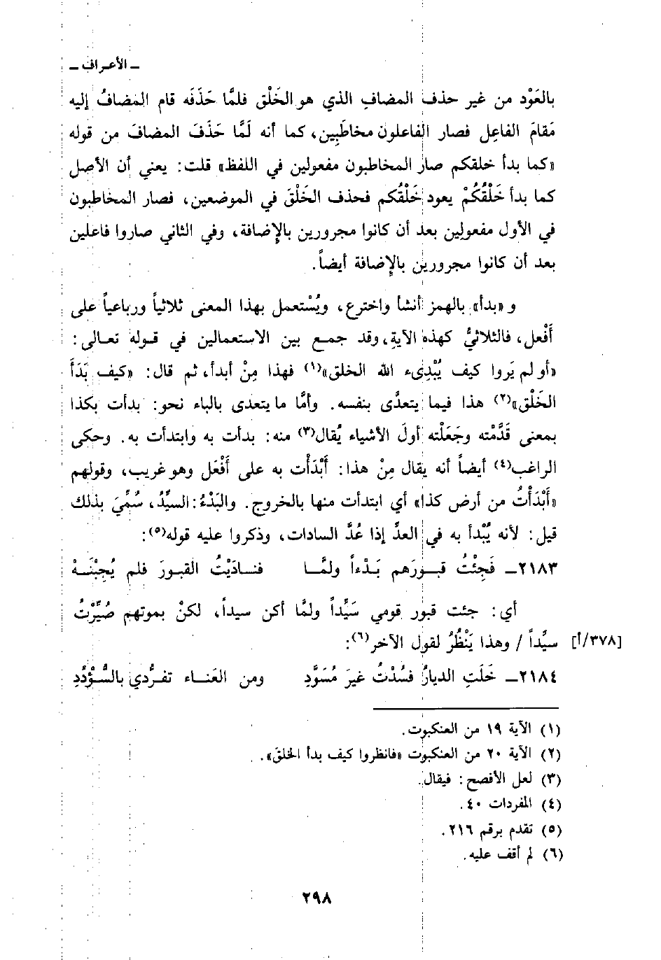 بالعَوْد من غير حذف المضافِ الذي هو الخَلْق فلمَّا حَذَفَه قام المضافُ إليه مَقَامَ الفاعِل فصار الفاعلون مخاطَبِين، كما أنه لَمَّا حَذَفَ المضافَ من قوله «كما بدأ خلقكم صار المخاطبون مفعولين في اللفظ» قلت: يعني أن الأصل كما بدأ خَلْقُكُمْ يعود خَلْقُكم فحذف الخَلْقَ في الموضعين، فصار المخاطبون في الأول مفعولِين بعد أن كانوا مجرورين بالإِضافة، وفي الثاني صاروا فاعلين بعد أن كانوا مجرورين بالإِضافة أيضاً.