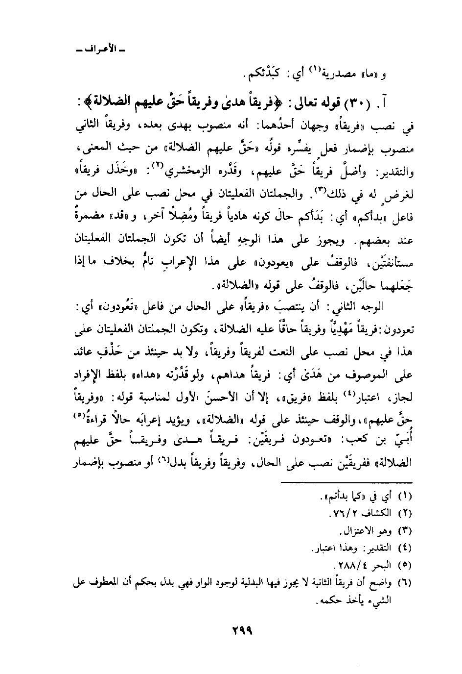 قوله تعالى: {فَرِيقاً هدى وَفَرِيقاً حَقَّ عَلَيْهِمُ الضلالة} : في نصب «فريقاً» وجهان أحدُهما: أنه منصوب بهدى بعده، وفريقاً الثاني منصوب بإضمار فعلٍ يفسِّره قولُه {حَقَّ عَلَيْهِمُ الضلالة} من حيث المعنى، والتقدير: وأضلَّ فريقاً حَقَّ عليهم، وقَدَّره الزمخشري: «وخَذَل فريقاً» لغرضٍ له في ذلك. والجملتان الفعليتان في محل نصب على الحال من فاعل «بدأكم» أي: بَدَأكم حالَ كونه هادياً فريقاً ومُضِلاً آخر، و «قد» مضمرةٌ عند بعضهم. ويجوز على هذا الوجهِ أيضاً أن تكون الجملتان الفعليتان مستأنفتَيْن، فالوقفُ على «يعودون» على هذا الإِعرابِ تامٌّ بخلاف ما إذا جَعَلهما حالَيْن، فالوقفُ على «يعودون» على هذا الإِعرابِ تامٌّ بخلاف ما إذا جَعَلهما حالَيْن، فالوقفُ على قوله «الضلالة» .