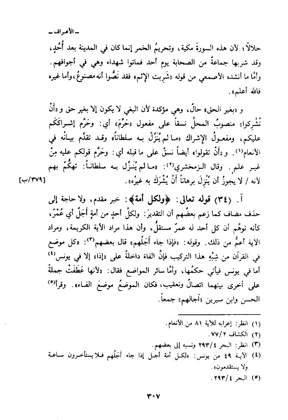 و {بِغَيْرِ الحق} حالٌ، وهي مؤكدة لأن البغي لا يكون إلا بغير حق و» أَنْ تُشْرِكوا «منصوبُ المحلِّ نسقاً على مفعول» حَرَّمَ «أي: وحَرَّم إشراكَكَم عليكم، ومفعولُ الإِشراك {مَا لَمْ يُنَزِّلْ بِهِ سُلْطَاناً} وقد تقدَّم بيانُه في الأنعام. و {أَن تقولوا} أيضاً نسقٌ على ما قبله أي: وحرَّم قولكم عليه مِنْ غير علمٍ. وقال الزمخشري:» ما لم يُنّزِّل به سلطاناً: تهكُّمٌ بهم لأنه/ لا يجوزُ أن يُنْزِلَ برهاناً أَنْ يُشْرَكَ به غيرُه «.