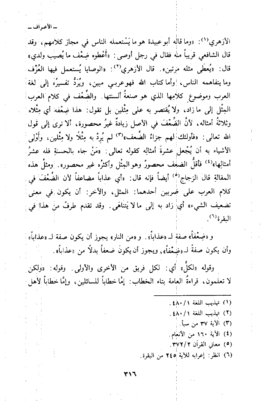 الأزهري: «وما قاله أبو عبيدة هو ما يَسْتعمله الناس في مجاز كلامهم، وقد قال الشافعي قريباً منه فقال في رجل أوصى:» أَعْطوه ضِعْف ما يُصيب ولدي «قال:» يُعطَى مثله مرتين «. قال الأزهري:» الوصايا يُستعمل فيها العُرْف وما يتفاهمه الناس، وأما كتاب الله فهو عربي مبين، ويُرَدُّ تفسيرُه إلى لغة العرب وموضوعِ كلامِها الذي هو صنعةُ ألسنتها. والضِّعْف في كلام العرب المِثْل إلى ما زاد، ولا يُقتصر به على مِثْلين بل تقول: هذا ضِعْفه أي مِثْلاه وثلاثةُ أمثاله، لأنَّ الضِّعْفَ في الأصل زيادةٌ غيرُ محصورة، ألا ترى إلى قول الله تعالى: {فأولئك لَهُمْ جَزَآءُ الضعف} [سبأ: 37] لم يُرِدْ به مِثْلاً ولا مِثْلين، وأَوْلى الأشياء به أن يُجْعل عشرةَ أمثالِه كقوله تعالى: «مَنْ جاء بالحسنةِ فله عشرُ أمثالِها» فأقلُّ الضعف محصورٌ وهو المِثْل وأكثرُه غير محصور «. ومثلُ هذه المقالةِ قال الزجاج أيضاً فإنه قال:» أي عذاباً مضاعفاً لأن الضِّعْفَ في كلام العرب على ضربين أحدهما: المثل، والآخر: أن يكون في معنى تضعيف الشيء «أي زاد به إلى ما لا يَتناهَى. وقد تقدم طرفٌ من هذا في البقرة.