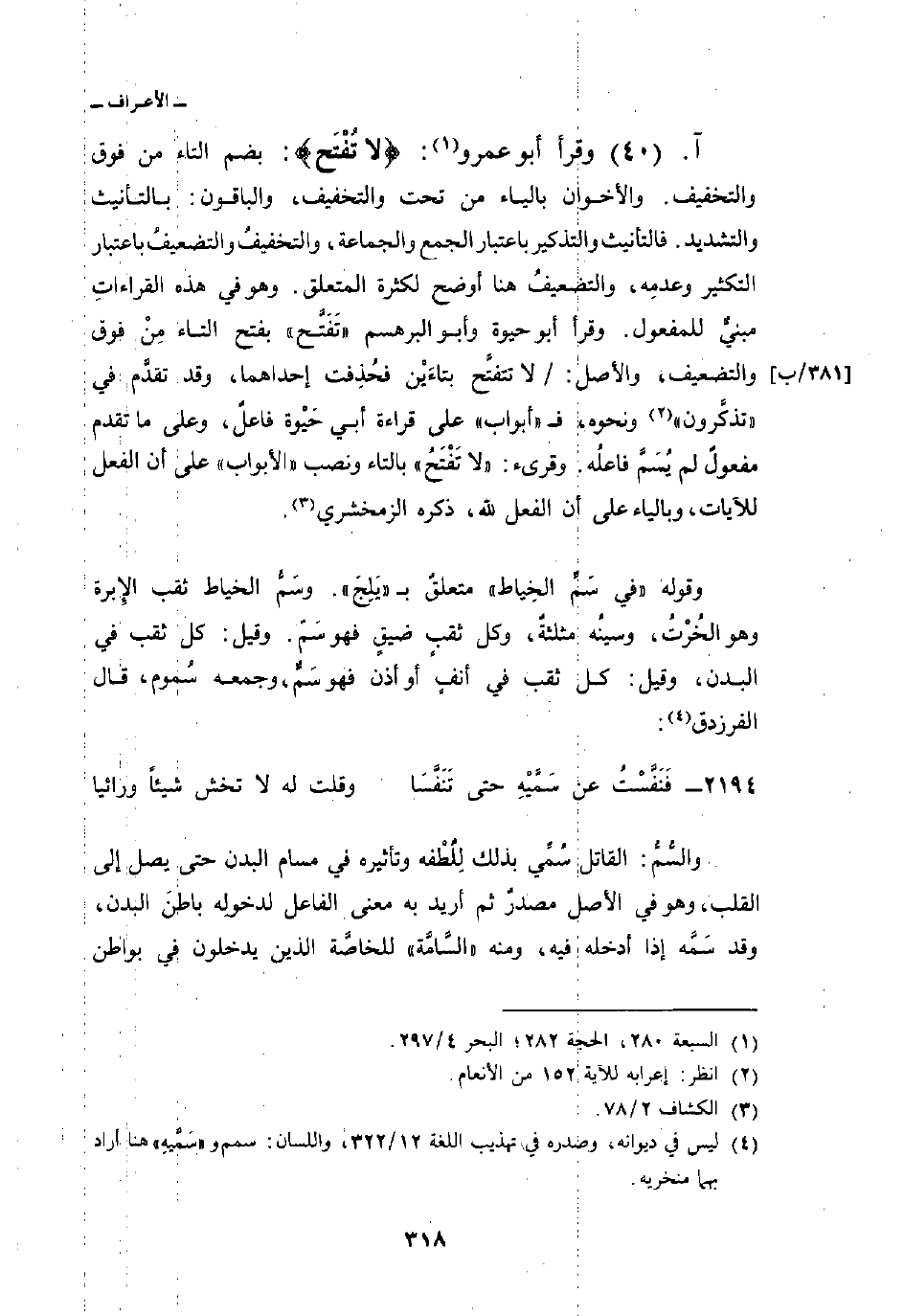 وقرأ أبو عمرو: {لا تُفْتَح} : بضم التاء من فوق والتخفيف. والأخوان بالياء من تحت والتخفيف، والباقون: بالتأنيث والتشديد. فالتأنيث والتذكير باعتبار الجمع والجماعة، والتخفيفُ والتضعيفُ باعتبار التكثير وعدمِه، والتضعيفُ هنا أوضح لكثرة المتعلق. وهو في هذه القراءاتِ مبنيٌّ للمفعول. وقرأ أبو حيوة وأبو البرهسم «تَفَتَّح» بفتح التاء مِنْ فوق والتضعيف، والأصل: / لا تتفتَّح بتاءَيْن فحُذِفت إحداهما، وقد تقدَّم في «تذكَّرون» ونحوه، ف «أبواب» على قراءة أبي حَيْوة فاعلٌ، وعلى ما تقدم مفعولٌ لم يُسَمَّ فاعلُه. وقرئ: «لا تَفْتَحُ» بالتاء ونصب «الأبواب» على أن الفعل للآيات، وبالياء على أن الفعل لله، ذكره الزمخشري.