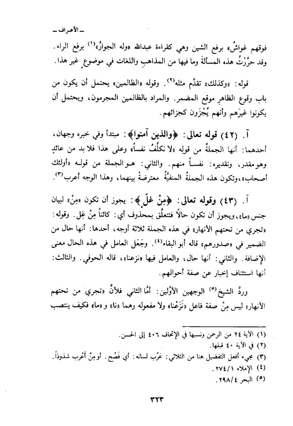 قوله تعالى: {والذين آمَنُواْ} : مبتدأ وفي خبره وجهان، أحدهما: أنها الجملةُ من قولِه {لاَ نُكَلِّفُ نَفْساً} وعلى هذا فلا بد من عائدٍ وهو مقدر، وتقديره: نفساً منهم. والثاني: هو الجملة من قوله {أولئك أَصْحَابُ} ، وتكون هذه الجملة المنفيَّةُ معترضةً بينهما، وهذا الوجه أعرب.