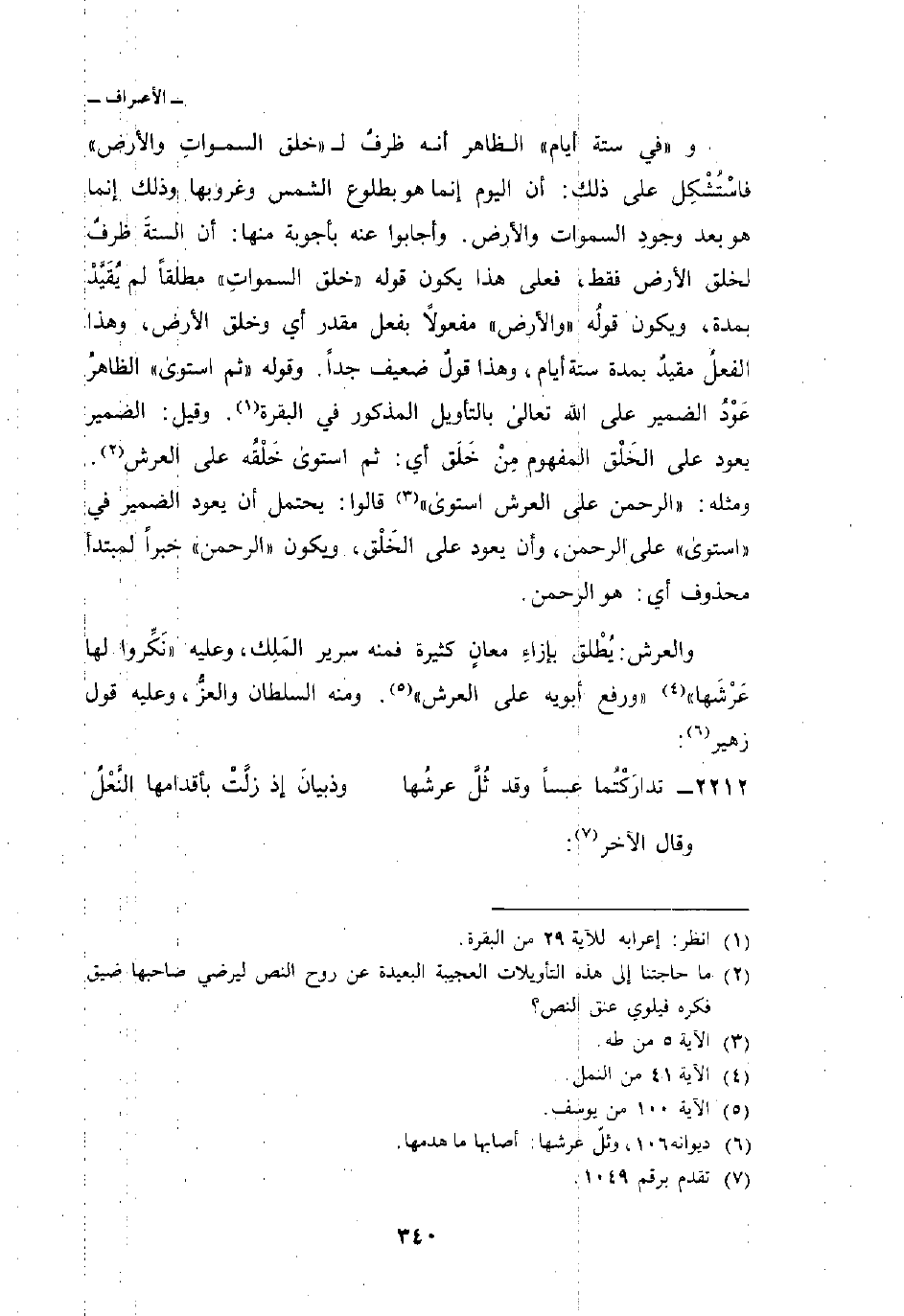 و {فِي سِتَّةِ أَيَّامٍ} الظاهر أنه ظرفٌ ل {خَلَقَ السماوات والأرض} فاسْتُشْكِل على ذلك: أن اليوم إنما هو بطلوع الشمس وغروبها وذلك إنما هو بعد وجودِ السماوات والأرض. وأجابوا عنه بأجوبة منها: أن الستةَ ظرفٌ لخلق الأرض فقط، فعلى هذا يكون قوله {خَلَقَ السماوات} مطلقاً لم يُقَيَّدْ بمدة، ويكون قولُه «والأرض» مفعولاً بفعل مقدر أي وخلق الأرض، وهذا الفعلُ مقيدٌ بمدة ستة أيام، وهذا قولٌ ضعيف جداً. وقوله «ثم استوى» الظاهرُ عَوْدُ الضمير على الله تعالى بالتأويل المذكور في البقرة. وقيل: الضمير يعود على الخَلْق المفهوم مِنْ خَلَق أي: ثم استوى خَلْقُه على العرش. ومثله: {الرحمن عَلَى العرش استوى} [طه: 5] قالوا: يحتمل أن يعود الضمير في «استوى» على الرحمن، وأن يعود على الخَلْق، ويكون «الرحمن» خبراً لمبتدأ محذوف أي: هو الرحمن.