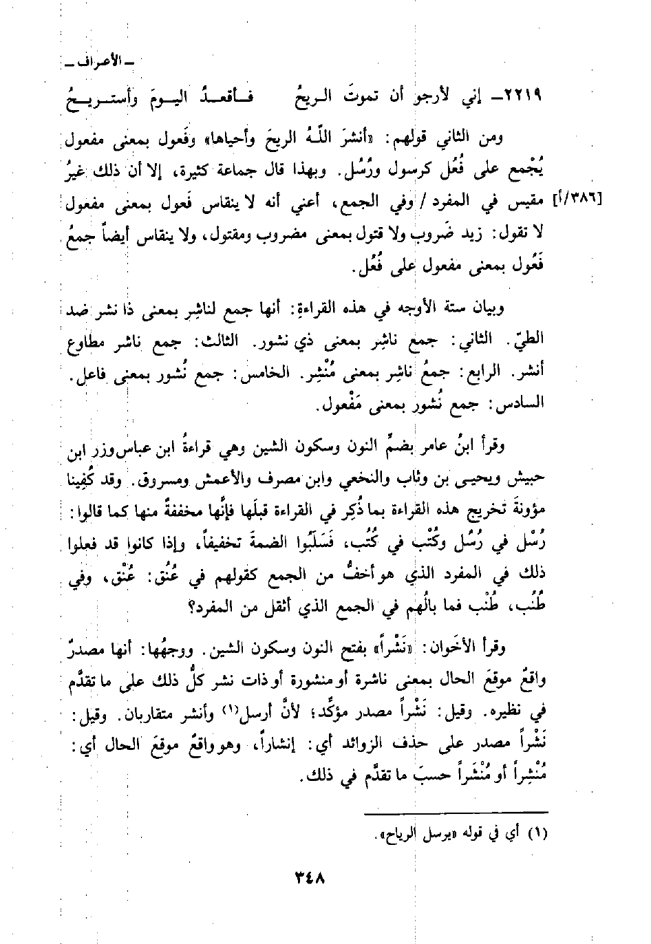 وبيان ستة الأوجه في هذه القراءةِ: أنها جمع لناشِر بمعنى ذا نشر ضد الطيّ. الثاني: جمع ناشِر بمعنى ذي نشور. الثالث: جمع ناشر مطاوع أنشر. الرابع: جمعُ ناشِر بمعنى مُنْشِر. الخامس: جمع نُشور بمعنى فاعل. السادس: جمع نُشور بمعنى مَفْعول.