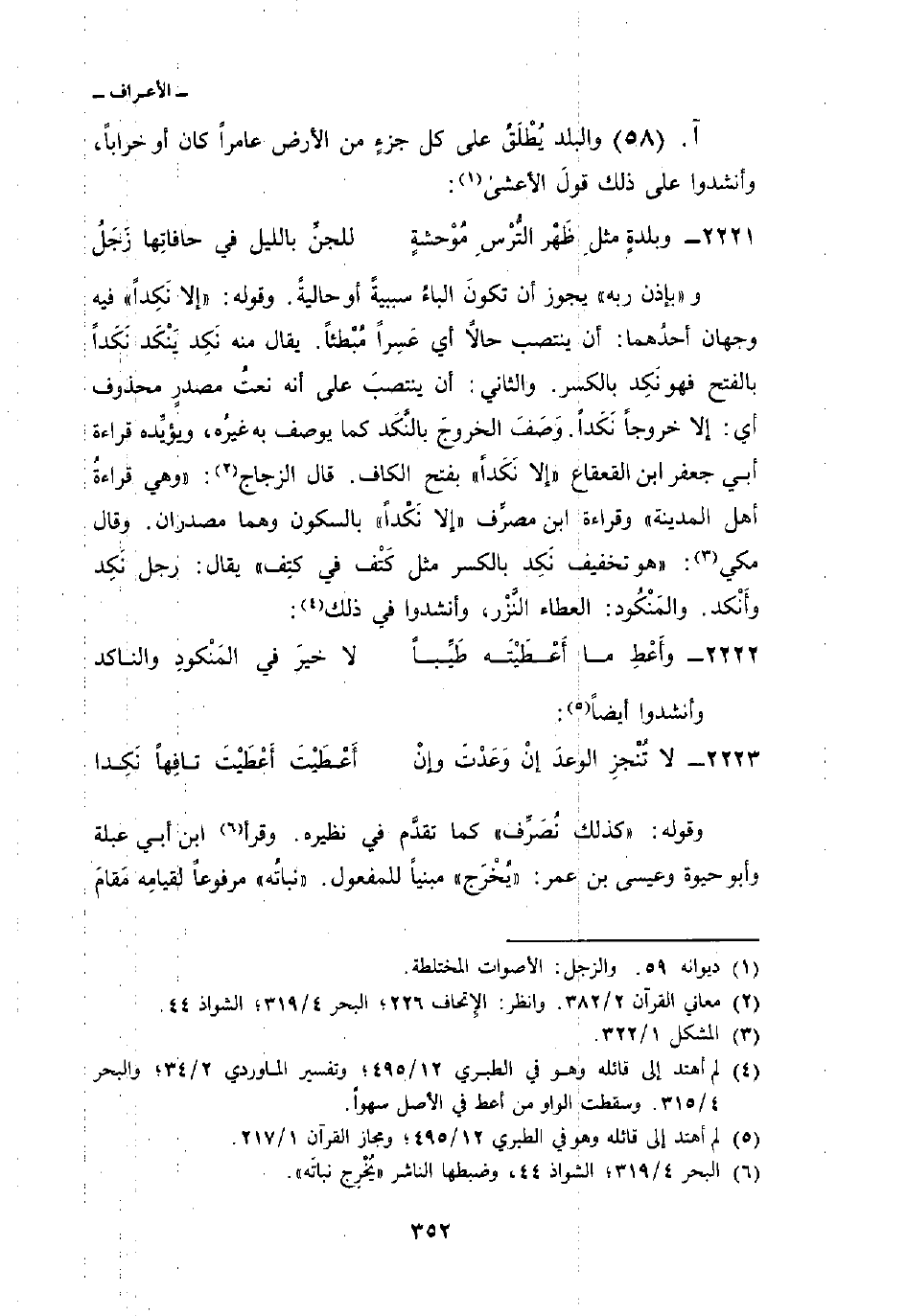 و {بِإِذْنِ رَبِّهِ} يجوز أن تكونَ الباءُ سببيةً أو حاليةً. وقوله: «إلا نَكِداً» فيه وجهان أحدُهما: أن ينتصب حالاً أي عَسِراً مُبْطئاً. يقال منه نَكِد يَنْكَد نَكَداً بالفتح فهو نَكِد بالكسر. والثاني: أن ينتصب على أنه نعتُ مصدرٍ محذوف أي: إلا خروجاً نَكَداً. وَصَفَ الخروجَ بالنَّكَد كما يوصف به غيرُه، ويؤيِّده قراءة أبي جعفر ابن القعقاع «إلا نَكَداً» بفتح الكاف. قال الزجاج: «وهي قراءةُ أهل المدينة» وقراءة ابن مصرِّف «إلا نَكْداً» بالسكون وهما مصدران. وقال مكي: «هو تخفيف نَكِد بالكسر مثل كَتْف في كتِف» يقال: رجل نَكِد وأَنْكد. والمَنْكُود: العطاء النَّزْر، وأنشدوا في ذلك: