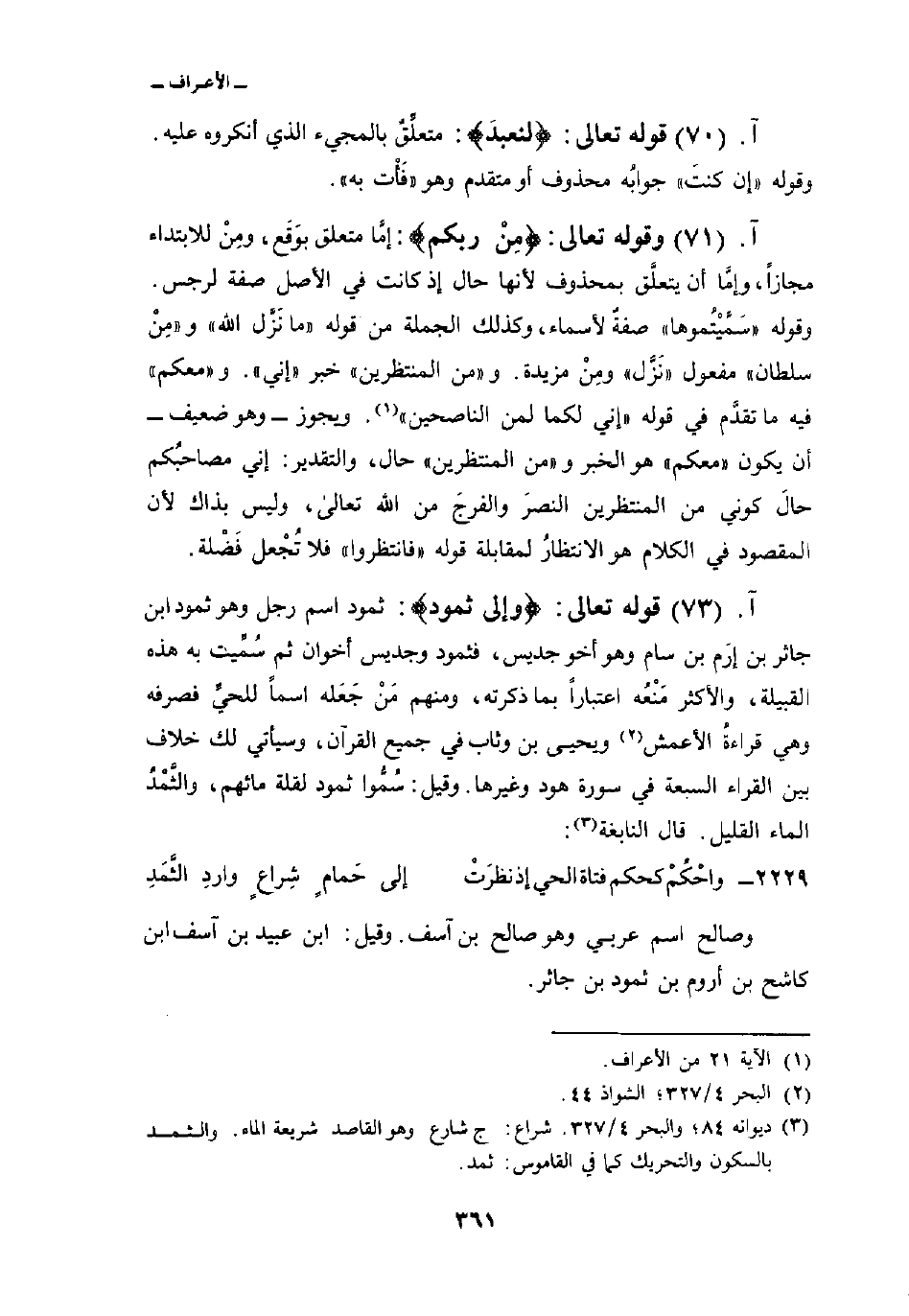 قوله تعالى: {وإلى ثَمُودَ} : ثمود اسم رجل وهو ثمود ابن جاثر بن إرَم بن سام وهو أخو جديس، فثمود وجديس أخوان ثم سُمِّيت به هذه القبيلة، والأكثر مَنْعُه اعتباراً بما ذكرته، ومنهم مَنْ جَعَله اسماً للحيِّ فصرفه وهي قراءةُ الأعمش ويحيى بن وثاب في جميع القرآن، وسيأتي لك خلاف بين القراء السبعة في سورة هود وغيرها. وقيل: سُمُّوا ثمود لقلة مائهم، والثَّمْدُ الماء القليل. قال النابغة: