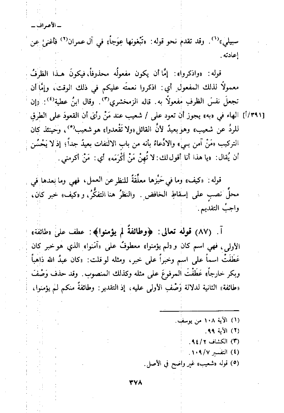 قوله: {واذكروا} : إمَّا أن يكون مفعولُه محذوفاً، فيكونَ هذا الظرفُ معمولاً لذلك المفعولِ أي: اذكروا نعمتَه عليكم في ذلك الوقت، وإمَّا أن تجعلَ نفسَ الظرفِ مفعولاً به. قاله الزمخشري. وقال ابنُ عطية:» إن الهاء في «به» يجوز أن تعود على/ شعيب عند مَنْ رأى أن القعودَ على الطرقِ للردِّ عن شعيب «وهو بعيدٌ لأنَّ القائل» ولا تَقْعدوا «هو شعيب، وحينئذ كان التركيب» مَنْ آمن بي «والادِّعاءُ بأنه من بابِ الالتفات بعيدٌ جداً؛ إذ لا يَحْسُن أن يُقال:» يا هذا أنا أقول لك: لا تُهِنْ مَنْ أَكْرَمَه «أي: مَنْ أكرمني.