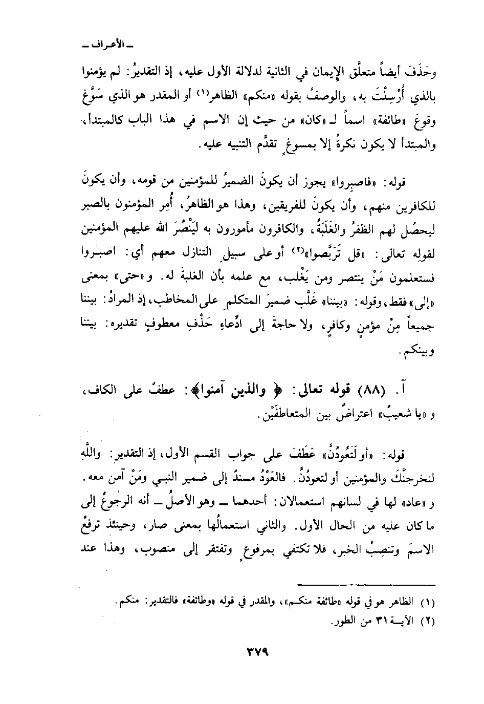 وحَذَفَ أيضاً متعلَّق الإِيمان في الثانية لدلالة الأول عليه، إذ التقديرُ: لم يؤمنوا بالذي أُرْسِلْتَ به، والوصفُ بقوله «منكم» الظاهر أو المقدر هو الذي سَوَّغ وقوعَ «طائفة» اسماً ل «كان» من حيث إن الاسم في هذا الباب كالمبتدأ، والمبتدأ لا يكون نكرةً إلا بمسوغٍ تقدَّم التنبيه عليه.