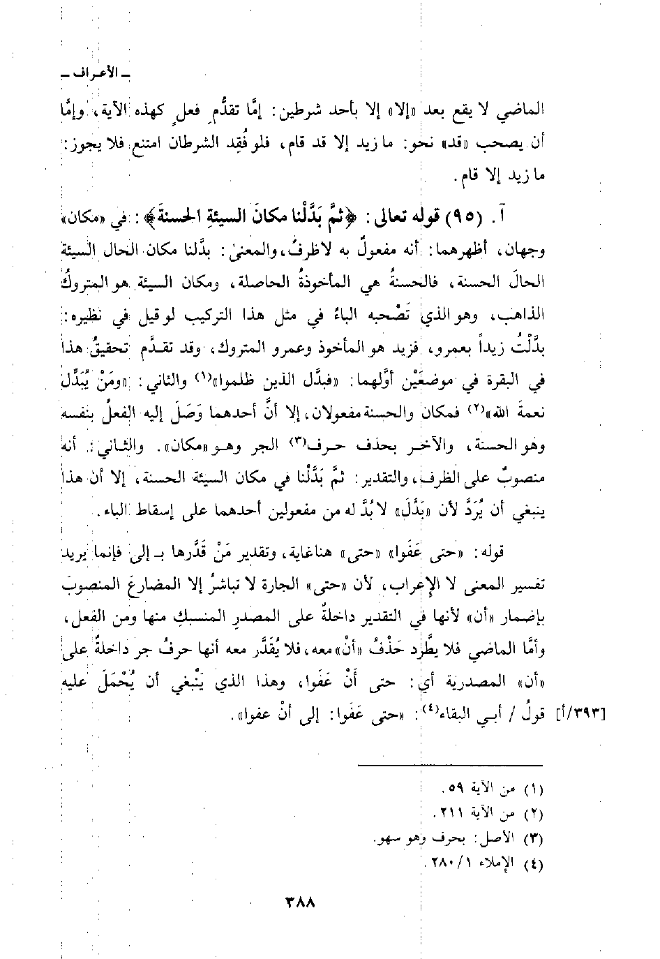 قوله: {حتى عَفَوْاْ} «حتى» هنا غاية، وتقدير مَنْ قَدَّرها ب إلى فإنما يريد تفسير المعنى لا الإِعراب، لأن «حتى» الجارة لا تباشرُ إلا المضارعَ المنصوبَ بإضمار «أن» لأنها في التقدير داخلةٌ على المصدرِ المنسبكِ منها ومن الفعل، وأمَّا الماضي فلا يطَّرد حَذْفُ «أنْ» معه، فلا يُقَدَّر معه أنها حرفُ جر داخلةٌ على «أن» المصدرية أي: حتى أَنْ عَفَوا، وهذا الذي يَنْبغي أن يُحْمَلَ عليه قولُ/ أبي البقاء: «حتى عَفَوا: إلى أنْ عفوا» .