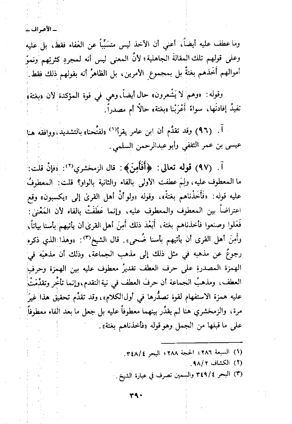 قوله تعالى: {أَفَأَمِنَ} : قال الزمخشري: «فإنْ قلت: ما المعطوف عليه، ولِمَ عطفت الأولى بالفاء والثانية بالواو؟ قلت: المعطوفُ عليه قوله:» فَأَخَذْناهم بعتةً «، وقوله» ولو أنَّ أهل القرى إلى «يكسبون» وقع اعتراضاً بين المعطوف والمعطوف عليه، وإنما عَطَفَتْ بالفاء لأن المَعْنى: فَعَلوا وصنعوا فأخذناهم بغتة، أَبَعْدَ ذلك أَمِنَ أهل القرى أن يأتيهم بأسنا بياتاً، وأَمِنَ أهل القرى أن يأتيهم بأسنا ضُحى «. قال الشيخ:» وهذا الذي ذكره رجوعٌ عن مذهبه في مثل ذلك إلى مذهب الجماعة، وذلك أن مذهبَه في الهمزة المصدرةِ على حرف العطف تقديرُ معطوف عليه بين الهمزة وحرفِ العطف، ومذهبُ الجماعة أن حرفَ العطف في نية التقدم، وإنما تأخَّر وتقدَّمَتْ عليه همزة الاستفهام لقوة تصدُّرها في أول الكلام «، وقد تقدَّم تحقيق هذا غيرَ مرة، والزمخشري هنا لم يقدِّر بينهما معطوفاً عليه بل جعل ما بعد الفاء معطوفاً على ما قبلها من الجمل وهو قوله» فأخذناهم بغتة «.