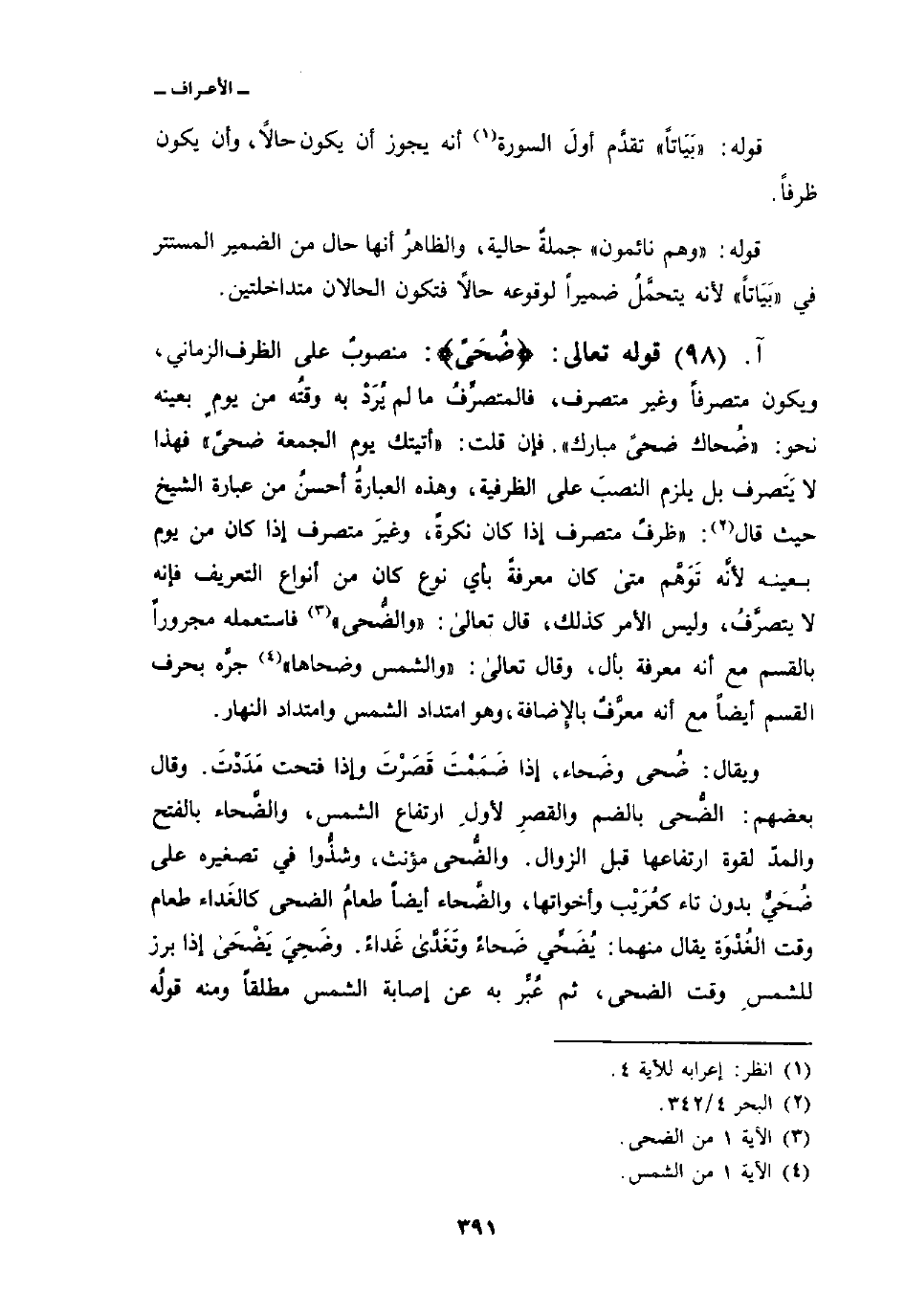 قوله تعالى: {ضُحَىً} : منصوبٌ على الظرف الزماني، ويكون متصرفاً وغير متصرف، فالمتصرِّفُ ما لم يُرَدْ به وقتُه من يومٍ بعينه نحو: «ضُحاك ضحىً مبارك» . فإن قلت: «أتيتك يوم الجمعة ضحىً» فهذا لا يَتَصرف بل يلزم النصبَ على الظرفية، وهذه العبارةُ أحسنُ من عبارة الشيخ حيث قال: «ظرفٌ متصرف إذا كان نكرةً، وغيرَ متصرف إذا كان من يوم بعينه لأنَّه تَوَهَّم متى كان معرفةً بأي نوع كان من أنواع التعريف فإنه لا يتصرَّفُ، وليس الأمر كذلك، قال تعالى: {والضحى} [الضحى: 1] فاستعمله مجروراً بالقسم مع أنه معرفة بأل، وقال تعالى: {والشمس وَضُحَاهَا} [الشمس: 1] جرَّه بحرف القسم أيضاً مع أنه معرَّفٌ بالإِضافة، وهو امتداد الشمس وامتداد النهار.