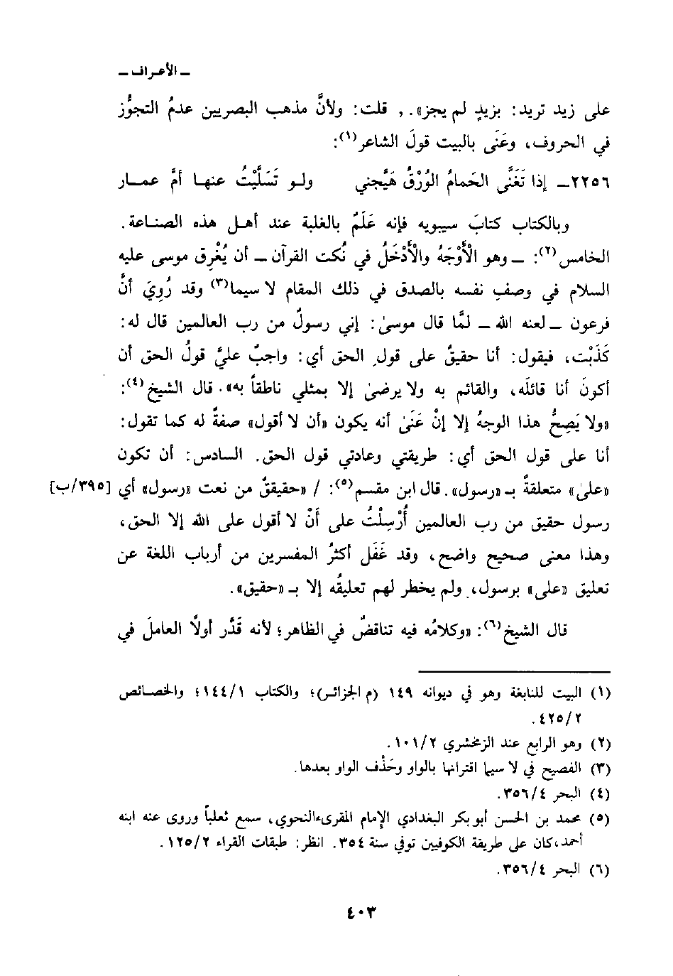 وبالكتاب كتابَ سيبويه فإنه عَلَمٌ بالغلبة عند أهل هذه الصناعة. الخامس: وهو الأَوْجَهُ والأَدْخَلُ في نُكت القرآن أن يُغْرِق موسى عليه السلام في وصفِ نفسه بالصدق في ذلك المقام لا سيما وقد رُوِيَ أنَّ فرعون لعنه الله لمَّا قال موسى: إني رسولٌ من رب العالمين قال له: كَذَبْت، فيقول: أنا حقيقٌ على قولِ الحق أي: واجبٌ عليَّ قولُ الحق أن أكونَ أنا قائلَه، والقائم به ولا يرضى إلا بمثلي ناطقاً به» . قال الشيخ: «ولا يَصِحُّ هذا الوجهُ إلا إنْ عَنَى أنه يكون» أن لا أقول «صفةٌ له كما تقول: أنا على قول الحق أي: طريقتي وعادتي قول الحق.