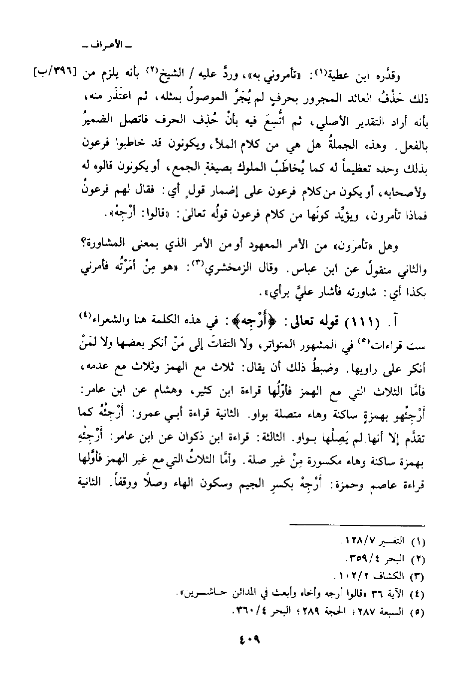 قوله تعالى: {أَرْجِهْ} : في هذه الكلمة هنا والشعراء ست قراءات في المشهور المتواتر، ولا التفاتَ إلى مَنْ أنكر بعضها ولا لمَنْ أنكر على راويها. وضبطُ ذلك أن يقال: ثلاث مع الهمز وثلاث مع عدمه، فأمَّا الثلاث التي مع الهمز فأوّلُها قراءة ابن كثير، وهشام عن ابن عامر: أَرْجِئْهو بهمزةٍ ساكنة وهاء متصلة بواو. الثانية قراءة أبي عمرو: أَرْجِئْهُ كما تقدَّم إلا أنها لم يَصِلْها بواو. الثانية قراءة أبي عمرو: أَرْجِئْهُ كما تقدَّم إلا أنها لم يَصِلْها بواو. الثالثة: قراءة ابن ذكوان عن ابن عامر: أَرْجِئْهِ بهمزة ساكنة وهاء مكسورة مِنْ غير صلة. وأمَّا الثلاثُ التي مع غير الهمز فأوَّلها قراءة عاصم وحمزة: أَرْجِهْ بكسرِ الجيم وسكون الهاء وصلاً ووقفاً. الثانية