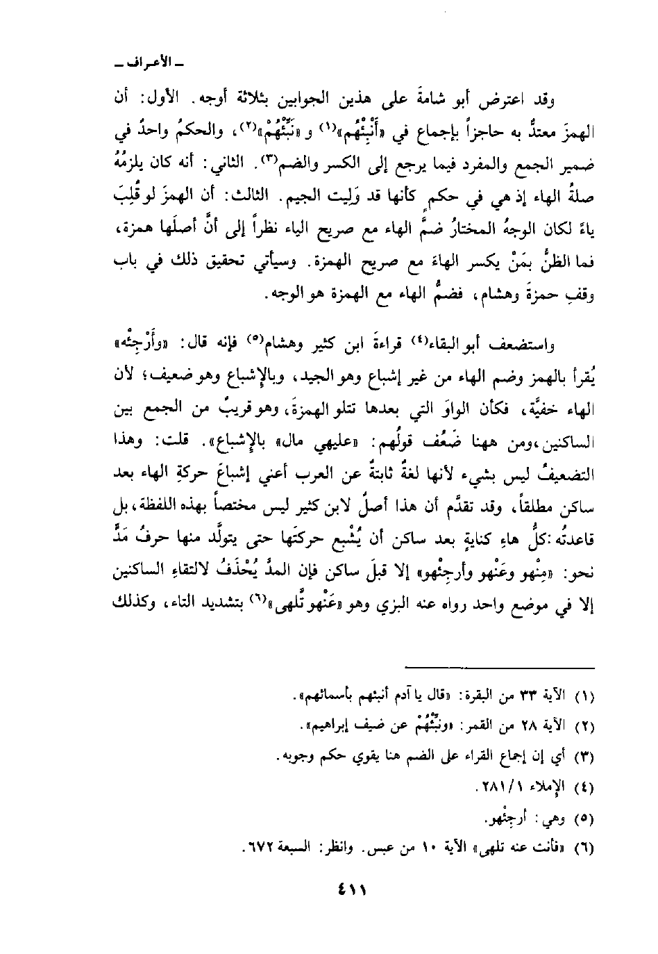 وقد اعترض أبو شامةَ على هذين الجوابين بثلاثة أوجه. الأول: أن الهمزَ معتدٌّ به حاجزاً بإجماع في {أَنبِئْهُمْ} [البقرة: 33] و {نَبِّئْهُمْ} [القمر: 28] ، والحكمُ واحدٌ في ضمير الجمع والمفرد فيما يرجع إلى الكسر والضم. الثاني: أنه كان يلزمُهُ صلةُ الهاء إذ هي في حكمٍ كأنها قد وَلِيت الجيم. الثالث: أن الهمزَ لو قُلِبَ ياءً لكان الوجهُ المختارُ ضمُّ الهاء مع صريح الياء نظراً إلى أنَّ أصلَها همزة، فما الظنُّ بمَنْ يكسر الهاءَ مع صريح الهمزة. وسيأتي تحقيق ذلك في باب وقفِ حمزةَ وهشام، فضمُّ الهاء مع الهمزة هو الوجه.