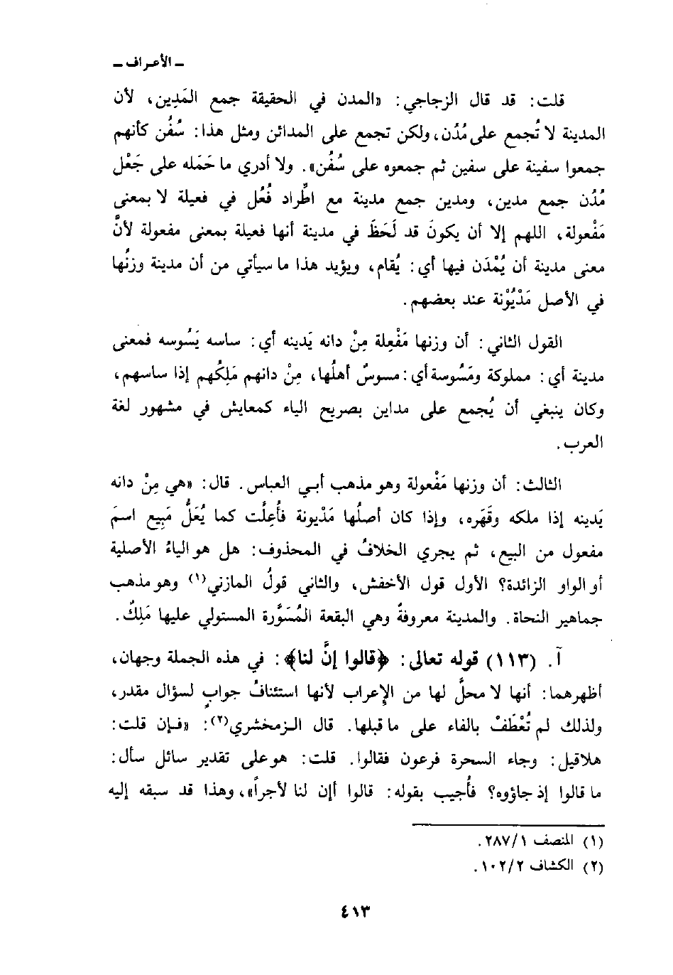 قلت: قد قال الزجاجي:» المدن في الحقيقة جمع المَدِين، لأن المدينة لا تُجمع على مُدُن، ولكن تجمع على المدائن ومثل هذا: سُفُن كأنهم جمعوا سفينة على سفين ثم جمعوه على سُفُن «. ولا أدري ما حَمَله على جَعْل مُدُن جمع مدين، ومدين جمع مدينة مع اطِّراد فُعُل في فعيلة لا بمعنى مَفْعولة، اللهم إلا أن يكونَ قد لَحَظَ في مدينة أنها فعيلة بمعنى مفعولة لأنَّ معنى مدينة أن يُمْدَن فيها أي: يُقام، ويؤيد هذا ما سيأتي من أن مدينة وزنُها في الأصل مَدْيُوْنة عند بعضهم.
