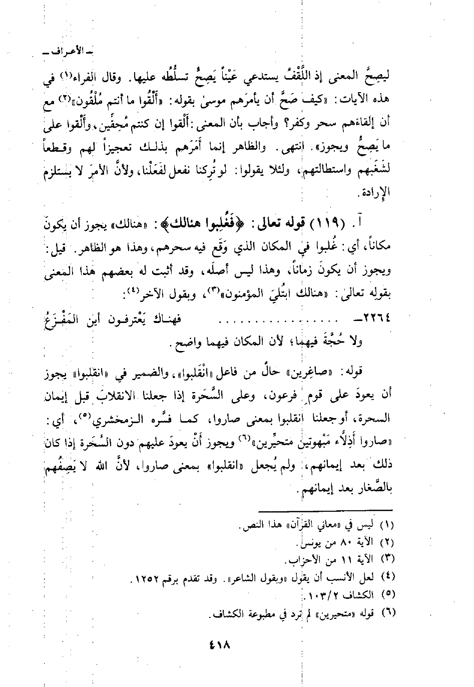 قوله تعالى: {فَغُلِبُواْ هُنَالِكَ} : «هنالك يجوز أن يكونَ مكاناً، أي: غُلبوا في المكان الذي وَقَع فيه سحرهم، وهذا هو الظاهر. قيل: ويجوز أن يكونَ زماناً، وهذا ليس أصلَه، وقد أثبت له بعضهم هذا المعنى بقولِه تعالى: {هُنَالِكَ ابتلي المؤمنون} [الأحزاب: 11] وبقول الآخر: