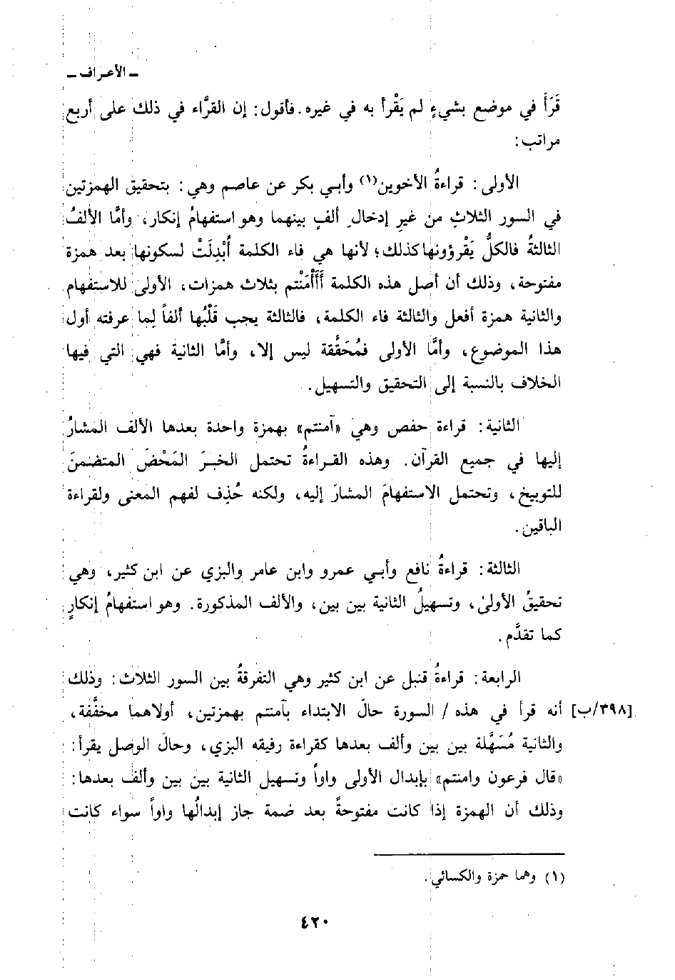 قَرَأَ في موضع بشيءٍ لم يَقْرأ به في غيره. فأقول: إن القرَّاء في ذلك على أربع مراتب: