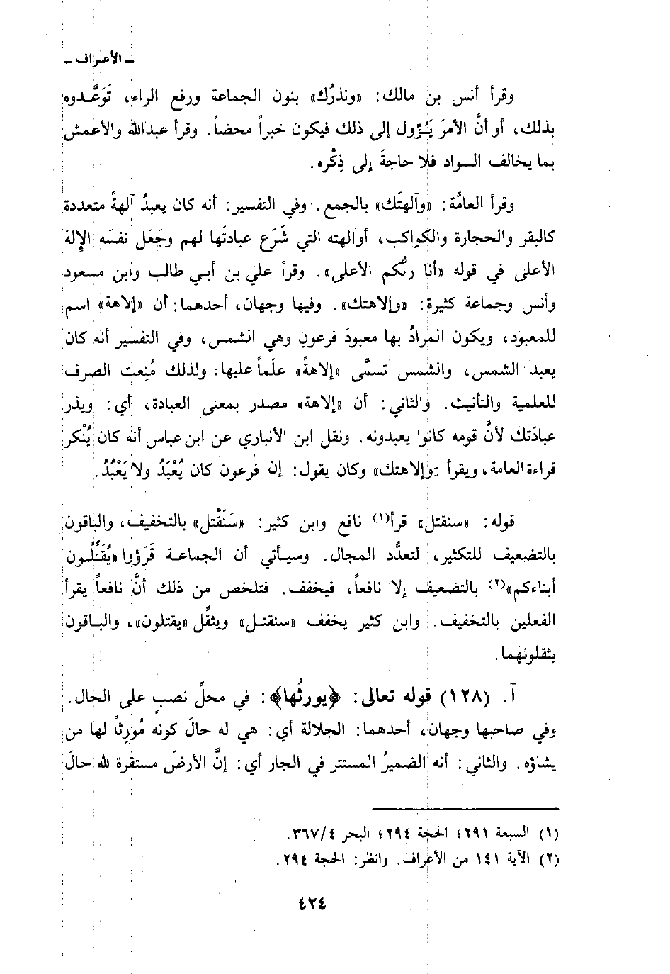 وقرأ العامَّة: «وآلهتكَ» بالجمع. وفي التفسير: أنه كان يعبدُ آلهةً متعددة كالبقر والحجارة والكواكب، أو آلهته التي شَرَع عبادتَها لهم وجَعَل نفسَه الإِلَه الأعلى في قوله {أَنَاْ رَبُّكُمُ الأعلى} . وقرأ علي بن أبي طالب وابن مسعود وأنس وجماعة كثيرة: «وإلاهتك» . وفيها وجهان، أحدهما: أن «إلاهة» اسم للمعبود، ويكون المرادُ بها معبودَ فرعونِ وهي الشمس، وفي التفسير أنه كان يعبد الشمس، والشمس تسمَّى «إلاهةً» علَماً عليها، ولذلك مُنِعت الصرف للعلمية والتأنيث. والثاني: أن «إلاهة» مصدر بمعنى العبادة، أي: ويذر عبادَتك لأنَّ قومه كانوا يعبدونه. ونقل ابن الأنباري عن ابن عباس أنه كان يُنْكر قراءة العامة، ويقرأ «وإلاهتك» وكان يقول: إن فرعون كان يُعْبَدُ ولا يَعْبُدُ.