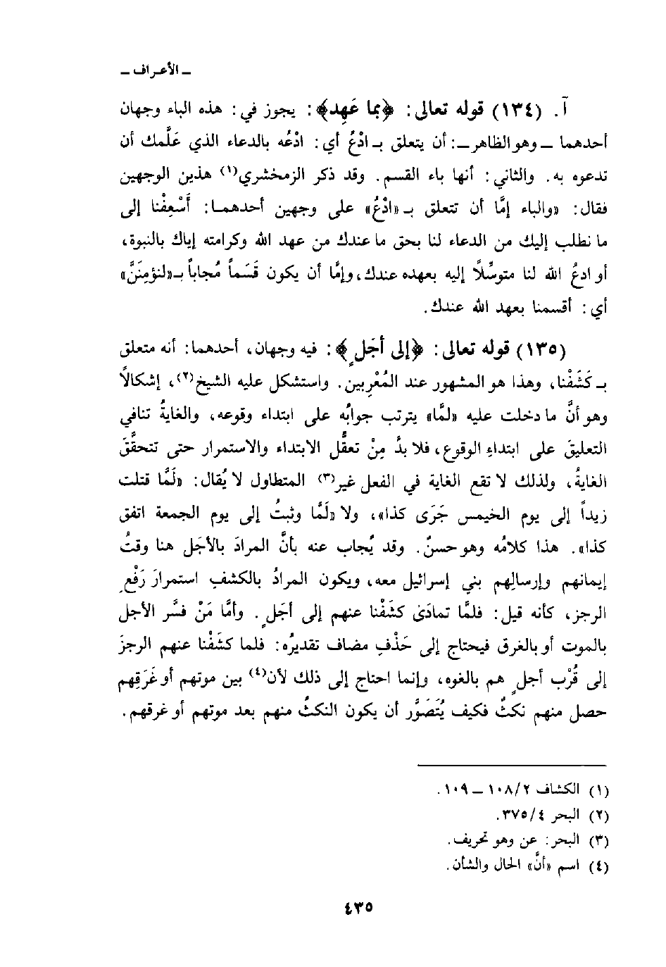 قوله تعالى: {إلى أَجَلٍ} : فيه وجهان، أحدهما: أنه متعلق ب كَشَفْنا، وهذا هو المشهور عند المُعْرِبين. واستشكل عليه الشيخ، إشكالاً وهو أنَّ ما دخلت عليه «لمَّا» يترتب جوابُه على ابتداء وقوعه، والغايةُ تنافي التعليقَ على ابتداءِ الوقوع، فلا بدَّ مِنْ تعقُّل الابتداء والاستمرار حتى تتحقَّقَ الغايةُ، ولذلك لا تقع الغاية في الفعل غير المتطاول لا يُقال: «لَمَّا قتلت زيداً إلى يوم الخميس جَرَى كذا» ، ولا «لَمَّا وثبتُ إلى يوم الجمعة اتفق كذا» . هذا كلامُه وهو حسنٌ. وقد يُجاب عنه بأنَّ المرادَ بالأجَل هنا وقتُ إيمانهم وإرسالِهم بني إسرائيل معه، ويكون المرادُ بالكشفِ استمرارَ رَفْعِ الرجز، كأنه قيل: فلمَّا تمادَى كشَفْنا عنهم إلى أجَلْ. وأمَّا مَنْ فسَّر الأجل بالموت أو بالغرق فيحتاج إلى حَذْفِ مضاف تقديرُه: فلما كشَفْنا عنهم الرجزَ إلى قُرْب أجلٍ هم بالغوه، وإنما احتاج إلى ذلك لأن بين موتهم أو غَرَقِهم حصل منهم نكثٌ فكيف يُتَصَوَّر أن يكون النكثُ منهم بعد موتهم أو غرقهم.
