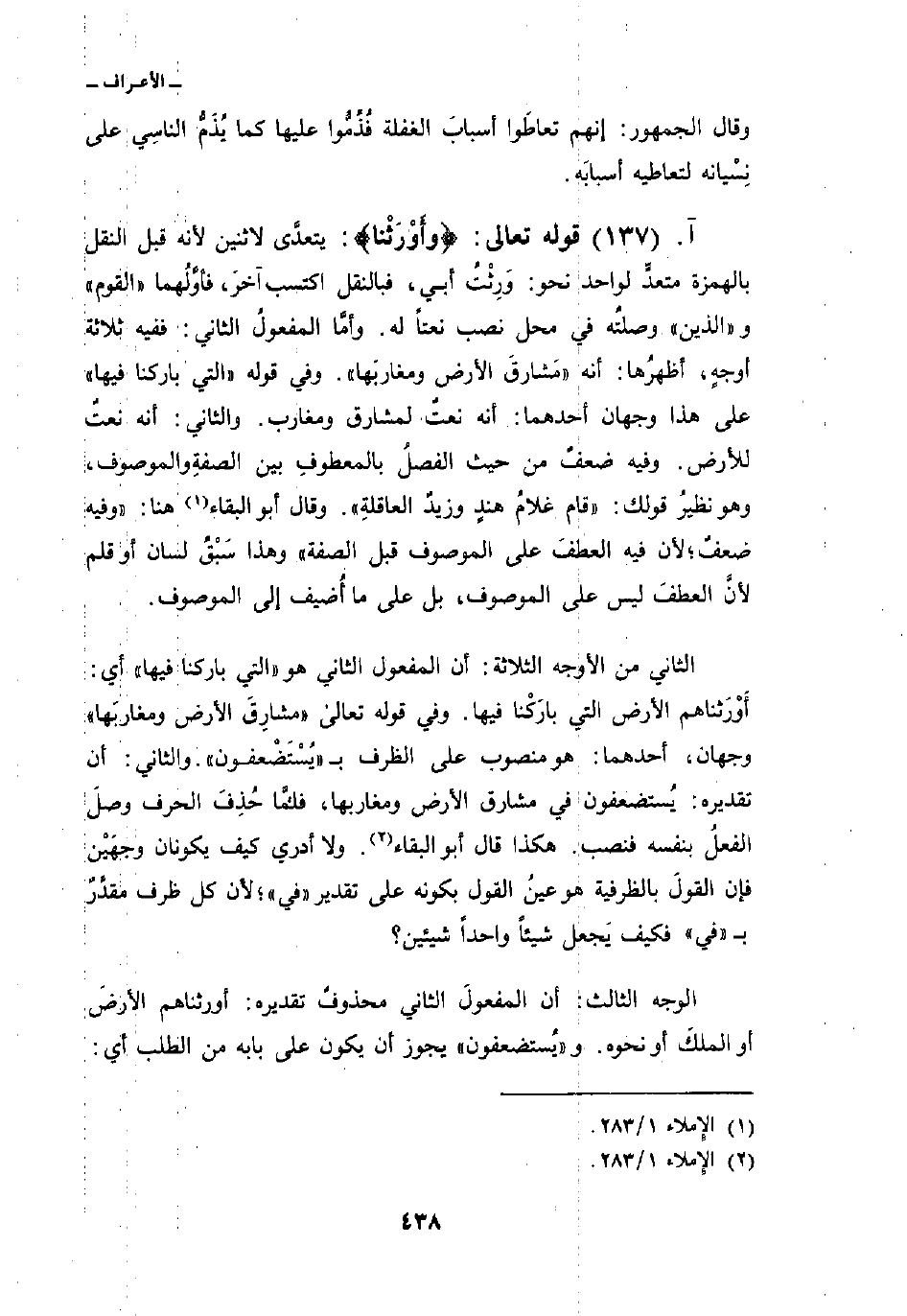 الثاني من الأوجه الثلاثة: أن المفعول الثاني هو {التي بَارَكْنَا فِيهَا} أي: أَوْرَثناهم الأرض التي بارَكْنا فيها. وفي قوله تعالى {مَشَارِقَ الأرض وَمَغَارِبَهَا} وجهان، أحدهما: هو منصوب على الظرف ب «يُسْتَضْعفون» . والثاني: أن تقديره: يُستضعفون في مشارق الأرض ومغاربها، فلمَّا حُذِفَ الحرف وصلَ الفعلُ بنفسه فنصب. هكذا قال أبو البقاء. ولا أدري كيف يكونان وجهَيْن فإن القولَ بالظرفية هو عينُ القول بكونه على تقدير «في» ؛ لأن كل ظرف مقدَّرٌ ب «في» فكيف يَجعل شيئاً واحداً شيئين؟