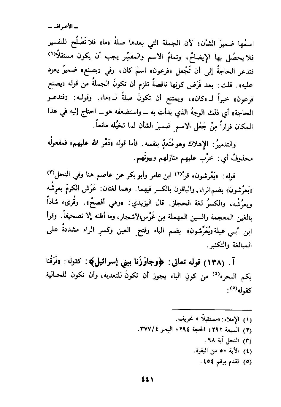 قوله: {يَعْرِشُونَ} قرأ ابن عامر وأبو بكر عن عاصم هنا وفي النحل «يَعرُشون» بضم الراء، والباقون بالكسر فيهما. وهما لغتان: عَرَش الكرمَ يعرِشُه ويعرُشُه، والكسرُ لغة الحجاز. قال اليزيدي: «وهي أفصحُ» . وقُرئ شاذاً بالغين المعجمة والسين المهملة مِن غَرْس الأشجار، وما أظنه إلا تصحيفاً. وقرأ ابن أبي عبلة «يُعَرِّشون» بضم الياء وفتحِ العين وكسرِ الراء مشددةً على المبالغة والتكثير.