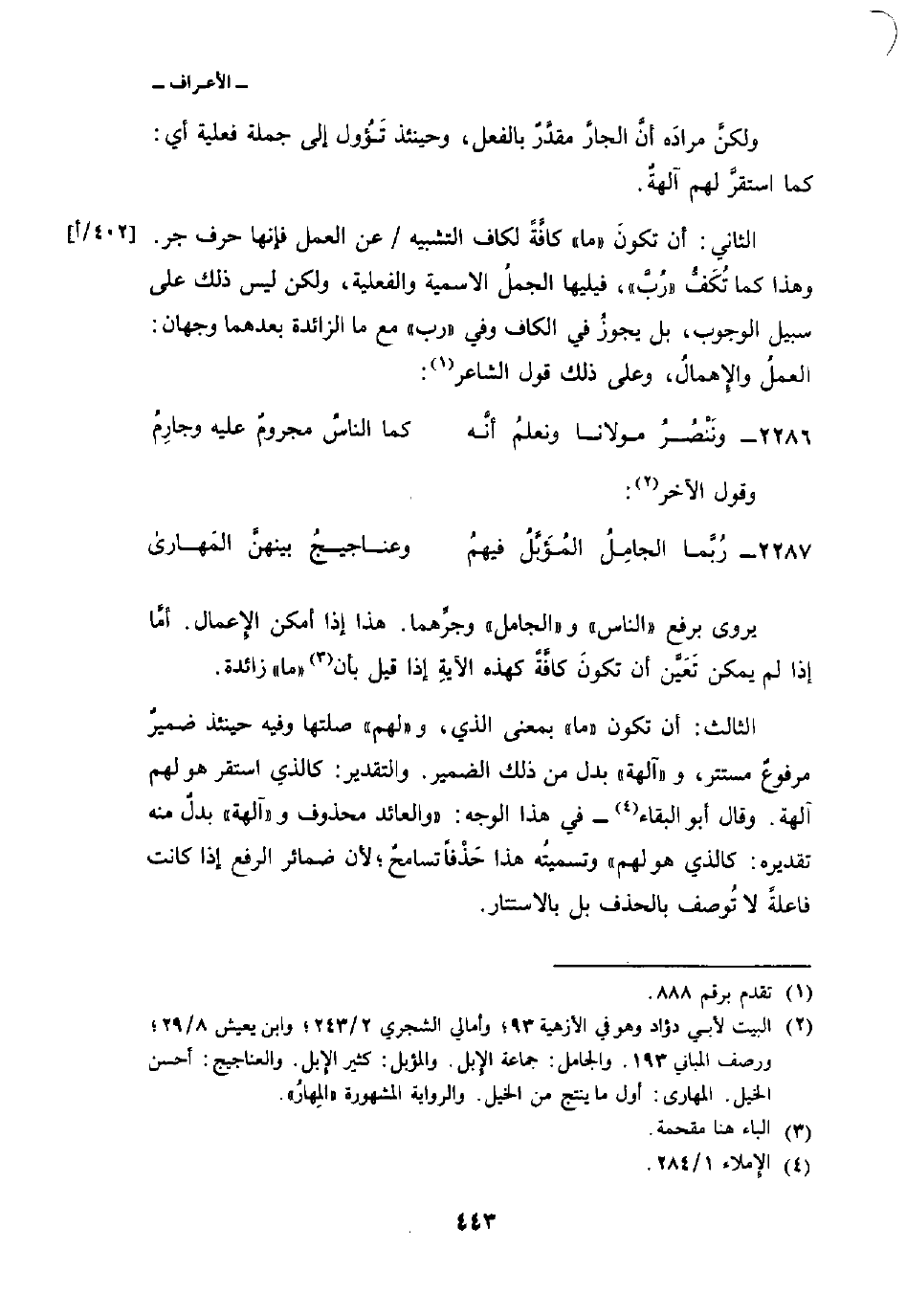 الثاني: أن تكونَ «ما» كافَّةً لكاف التشبيه/ عن العمل فإنها حرف جر. وهذا كما تُكَفُّ «رُبَّ» ، فيليها الجملُ الاسمية والفعلية، ولكن ليس ذلك على سبيل الوجوب، بل يجوزُ في الكاف وفي «رب» مع ما الزائدة بعدهما وجهان: العملُ والإِهمالُ، وعلى ذلك قول الشاعر: