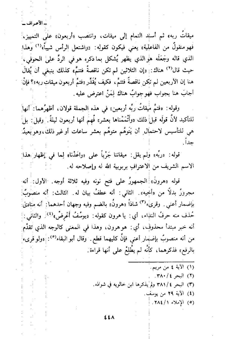 ميقاتُ ربه «ثم أسند التمام إلى ميقات، وانتصب» أربعون «على التمييز، فهو منقولٌ من الفاعلية» يعني فيكون كقولِه: {واشتعل الرأس شَيْباً} [مريم: 4] وهذا الذي قاله وجَعَلَه هو الذي يظهر يُشكل بما ذكره هو في الردِّ على الحوفي، حيث قال هناك: «إن الثلاثين لم تكن ناقصةً فتتمَّ» كذلك ينبغي أن يُقالَ هنا إن الأربعين لم تكن ناقصةً فتتمَّ، فكيف يُقَدِّر «فتمَّ أربعون ميقات ربه» ؟ فإنْ أجابَ هنا بجواب فهو جوابٌ هناك لِمَنْ اعترض عليه.