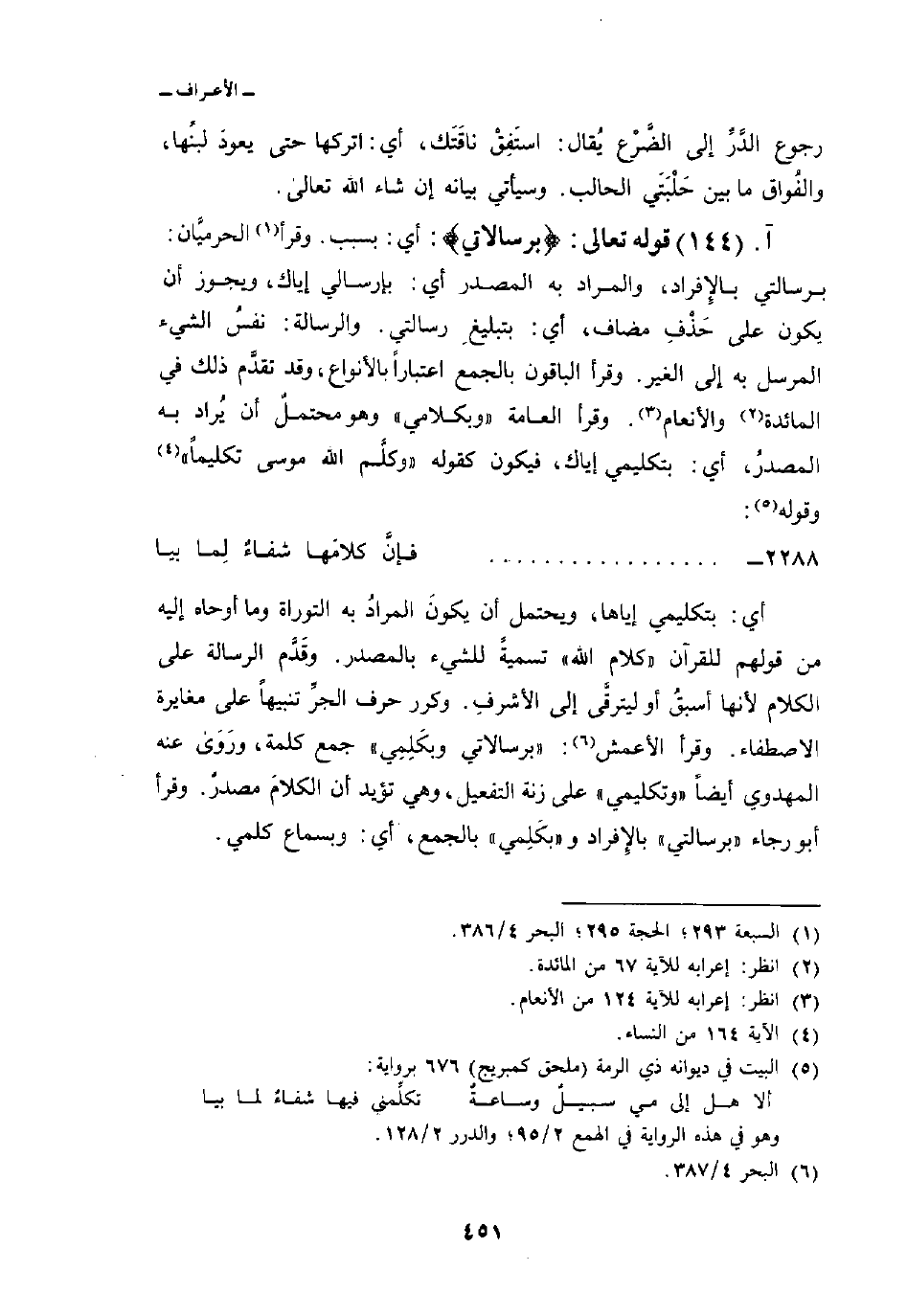 قوله تعالى: {بِرِسَالاَتِي} : أي: بسبب. وقرأ الحرميَّان: برسالتي بالإِفراد، والمراد به المصدر أي: بإرسالي إياك، ويجوز أن يكون على حَذْفِ مضاف، أي: بتبليغِ رسالتي. والرسالة: نفسُ الشيء المرسل به إلى الغير. وقرأ الباقون بالجمع اعتباراً بالأنواع، وقد تقدَّم ذلك في المائدة والأنعام. وقرأ العامة «وبكلامي» وهو محتملٌ أن يُراد به المصدرُ، أي: بتكليمي إياك، فيكون كقوله {وَكَلَّمَ الله موسى تَكْلِيماً} [النساء: 164] وقوله: