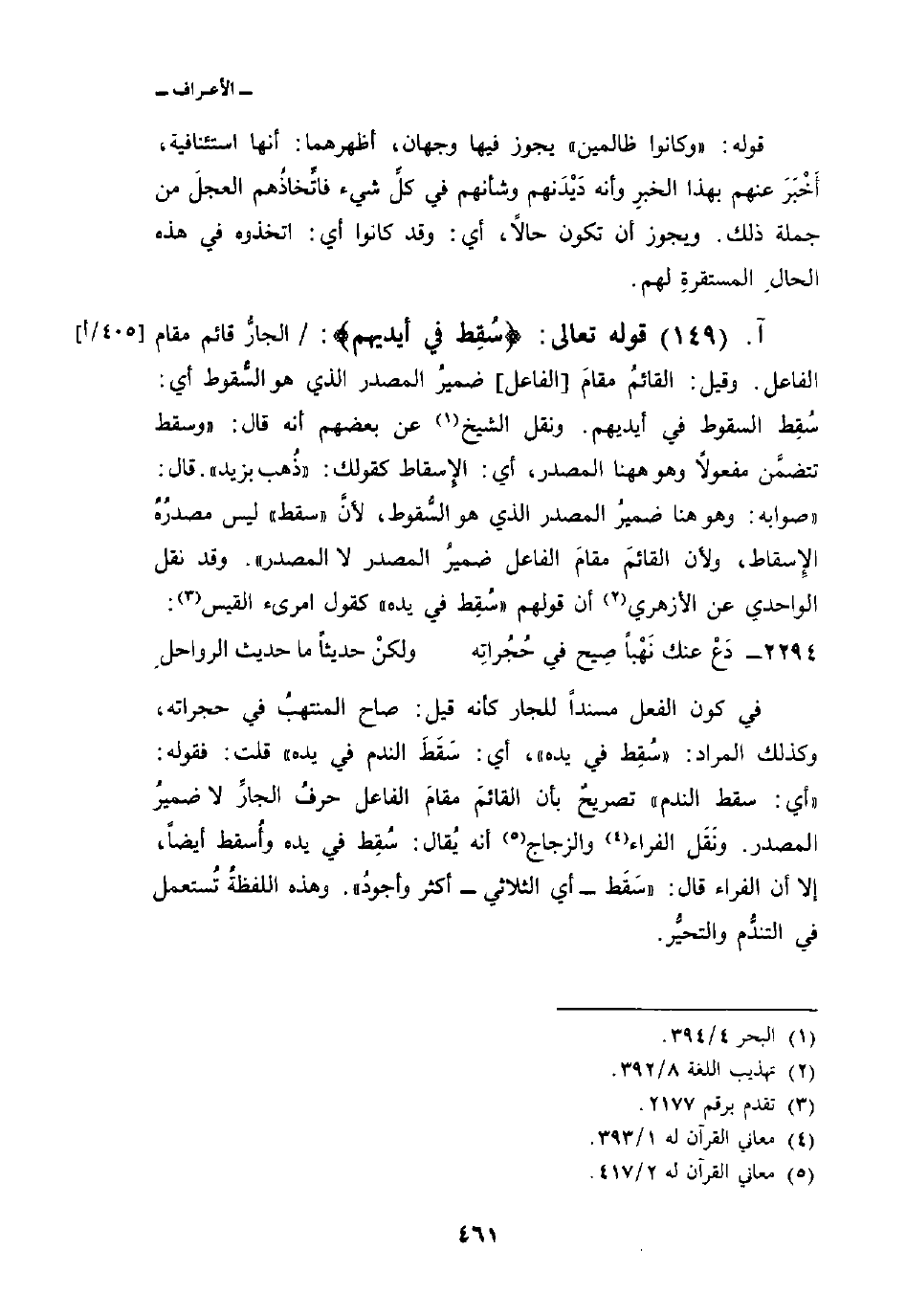 في كون الفعل مسنداً للجار كأنه قيل: صاح المنتهبُ في حجراته، وكذلك المراد:» سُقِط في يده «، أي: سَقَطَ الندم في يده» قلت: فقوله: «أي: سقط الندم» تصريحٌ بأن القائمَ مقامَ الفاعل حرفُ الجارِّ لا ضميرُ المصدر. ونَقَل الفراء والزجاج أنه يُقال: سُقِط في يده وأُسقط أيضاً، إلا أن الفراء قال: «سَقَط أي الثلاثي أكثر وأجودُ» . وهذه اللفظةُ تُستعمل في التندُّم والتحيُّر.