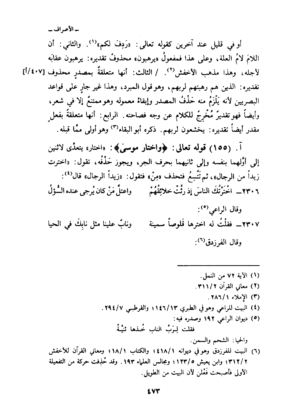أو في قليل عند آخرين كقوله تعالى: {رَدِفَ لَكُم} [النمل: 72] . والثاني: أن اللامَ لامُ العلة، وعلى هذا فمفعولُ «يرهبون» محذوفٌ تقديره: يرهبون عقابَه لأجله، وهذا مذهب الأخفش. / الثالث: أنها متعلقةٌ بمصدرٍ محذوف تقديره: الذين هم رهبتهم لربهم، وهو قول المبرد، وهذا غير جارٍ على قواعد البصريين لأنه يَلْزَمُ منه حَذْفُ المصدر وإبقاءُ معموله وهو ممتنعٌ إلا في شعر، وأيضاً فهو تقديرٌ مُخْرِجٌ للكلام عن وجه فصاحته. الرابع: أنها متعلقةٌ بفعلٍ مقدر أيضاً تقديره: يخشعون لربهم. ذكره أبو البقاء وهو أولى ممَّا قبله.