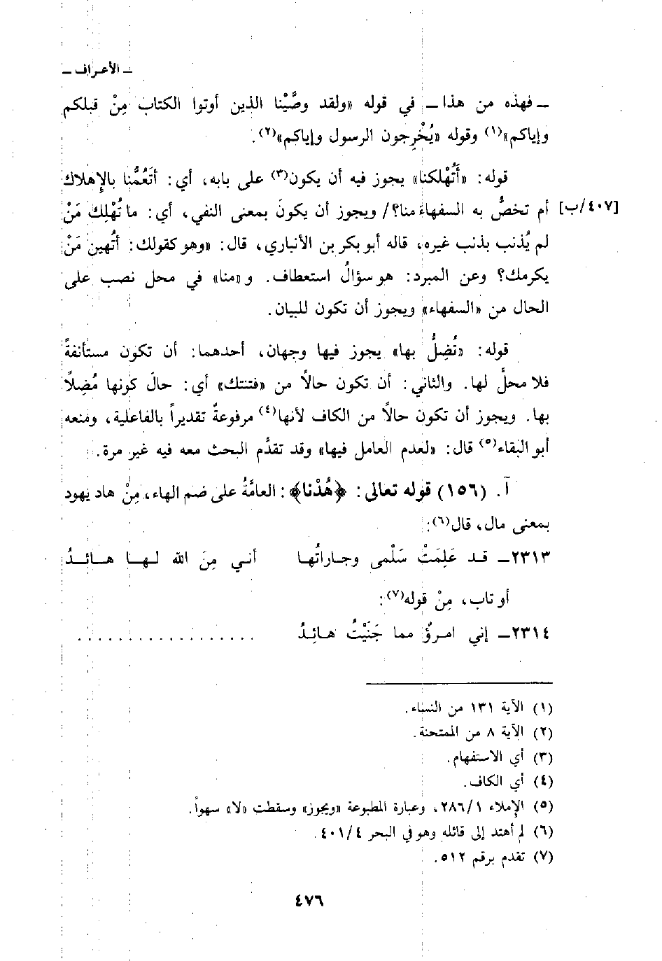 قوله: {أَتُهْلِكُنَا} يجوز فيه أن يكون على بابه، أي: أتَعُمُّنا بالإِهلاك أم تخصُّ به السفهاءَ منا؟ / ويجوز أن يكونَ بمعنى النفي، أي: ما تُهْلِك مَنْ لم يُذنب بذنب غيره، قاله أبو بكر بن الأنباري، قال: «وهو كقولك: أتُهين مَنْ يكرمك؟ وعن المبرد: هو سؤالُ استعطاف. و» منا «في محل نصب على الحال من» السفهاء «ويجوز أن تكون للبيان.