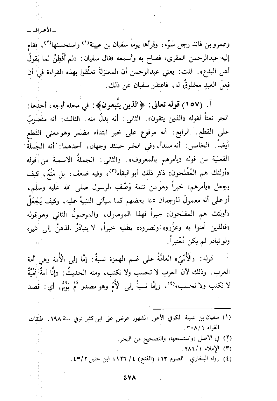قوله تعالى: {الذين يَتَّبِعُونَ} : في محله أوجه، أحدها: الجر نعتاً لقوله «الذين يتقون» . الثاني: أنه بدلٌ منه. الثالث: أنه منصوبٌ على القطع. الرابع: أنه مرفوع على خبر ابتداء مضمر وهو معنى القطع أيضاً. الخامس: أنه مبتدأ، وفي الخبر حينئذ وجهان، أحدهما: أنه الجملةُ الفعلية من قوله «يأمرهم بالمعروف» . والثاني: الجملةُ الاسمية من قوله {أولئك هُمُ المفلحون} ذكر ذلك أبو البقاء، وفيه ضعف، بل مَنْعٌ، كيف يجعل «يأمرهم» خبراً وهو من تتمة وَصْفِ الرسول صَلَّى اللهُ عَلَيْهِ وَسَلَّمَ، أو على أنه معمولٌ للوجدان عند بعضهم كما سيأتي التنبيهُ عليه، وكيف يَجْعَلُ «أولئك هم المفلحون» خبراً لهذا الموصول، والموصولُ الثاني وهو قوله {فالذين آمَنُواْ بِهِ وَعَزَّرُوهُ وَنَصَرُوهُ} يطلبه خبراً، لا يتبادَرُ الذهنُ إلى غيره ولو تبادر لم يكن مُعْتبراً.