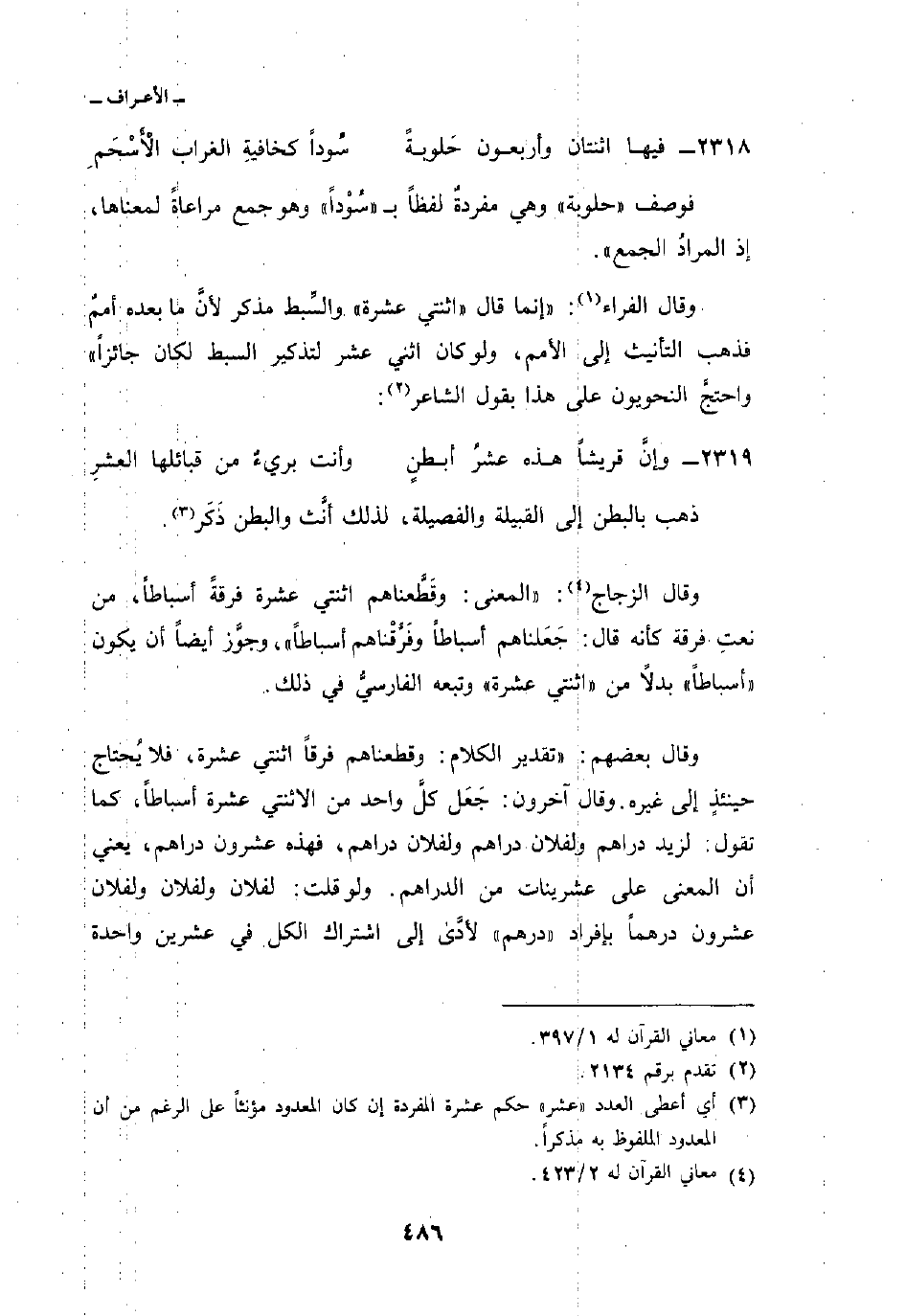 وقال بعضهم:» تقدير الكلام: وقطعناهم فرقاً اثنتي عشرة، فلا يُحتاج حينئذٍ إلى غيره. وقال آخرون: جَعَل كلَّ واحد من الاثنتي عشرة أسباطاً، كما تقول: لزيد دراهم ولفلان دراهم ولفلان دراهم، فهذه عشرون دراهم، يعني أن المعنى على عشرينات من الدراهم. ولو قلت: لفلان ولفلان ولفلان عشرون درهماً بإفراد «درهم» لأدَّى إلى اشتراك الكل في عشرين واحدة