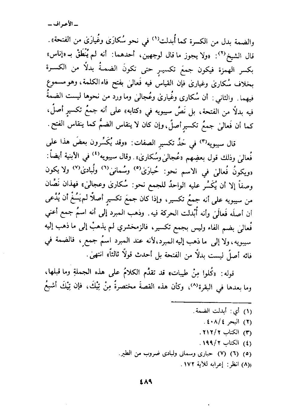 قال سيبويه في حَدِّ تكسيرِ الصفات:» وقد يُكَسِّرون بعضَ هذا على فُعالى وذلك قول بعضِهم «عُجالى وسُكارى» . وقال سيبويه في الأبنية أيضاً: «ويكونُ فُعالى في الاسم نحو: حُبارَى وسُمانى ولُبادى ولا يكون وصفاً إلا أن يُكَسَّر عليه الواحدُ للجمع نحو: سُكارى وعجالى» فهذان نَصَّان من سيبويه على أنه جمعُ تكسير، وإذا كان جمعَ تكسيرٍ أصلاً لم يَسْغُ أن يُدَّعى أن أصلَه فَعالَى وأنه أُبْدلت الحركة فيه. وذهب المبرد إلى أنه اسمُ جمع أعني فُعالى بضم الفاء وليس بجمع تكسير، فالزمخشري لم يذهبْ إلى ما ذهب إليه سيبويه، ولا إلى ما ذهب إليه المبرد، لأنه عند المبرد اسمُ جمعٍ، فالضمة في فائه أصلٌ ليست بدلاً من الفتحة بل أحدث قولاً ثالثاً «انتهى.