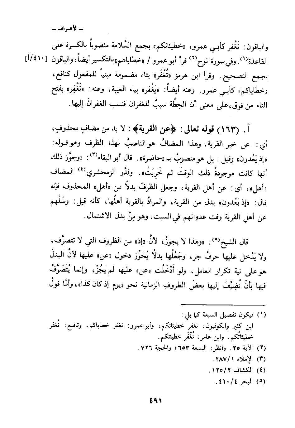 قوله تعالى: {عَنِ القرية} : لا بد من مضافٍ محذوفٍ، أي: عن خبر القرية، وهذا المضافُ هو الناصبُ لهذا الظرف وهو قوله: «إذ يعدون» وقيل: بل هو منصوبٌ ب «حاضرة» . قال أبو البقاء: «وجوَّز ذلك أنها كانت موجودةً ذلك الوقتَ ثم خَرِبَتْ» . وقدَّر الزمخشري المضاف «أهل» ، أي: عن أهل القرية، وجعل الظرفَ بدلاً من «أهل» المحذوف فإنه قال: «إذ يَعْدون» بدل من القرية، والمرادُ بالقرية أهلُها، كأنه قيل: وسَلْهم عن أهل القرية وقت عدوانهم في السبت، وهو مِنْ بدل الاشتمال.
