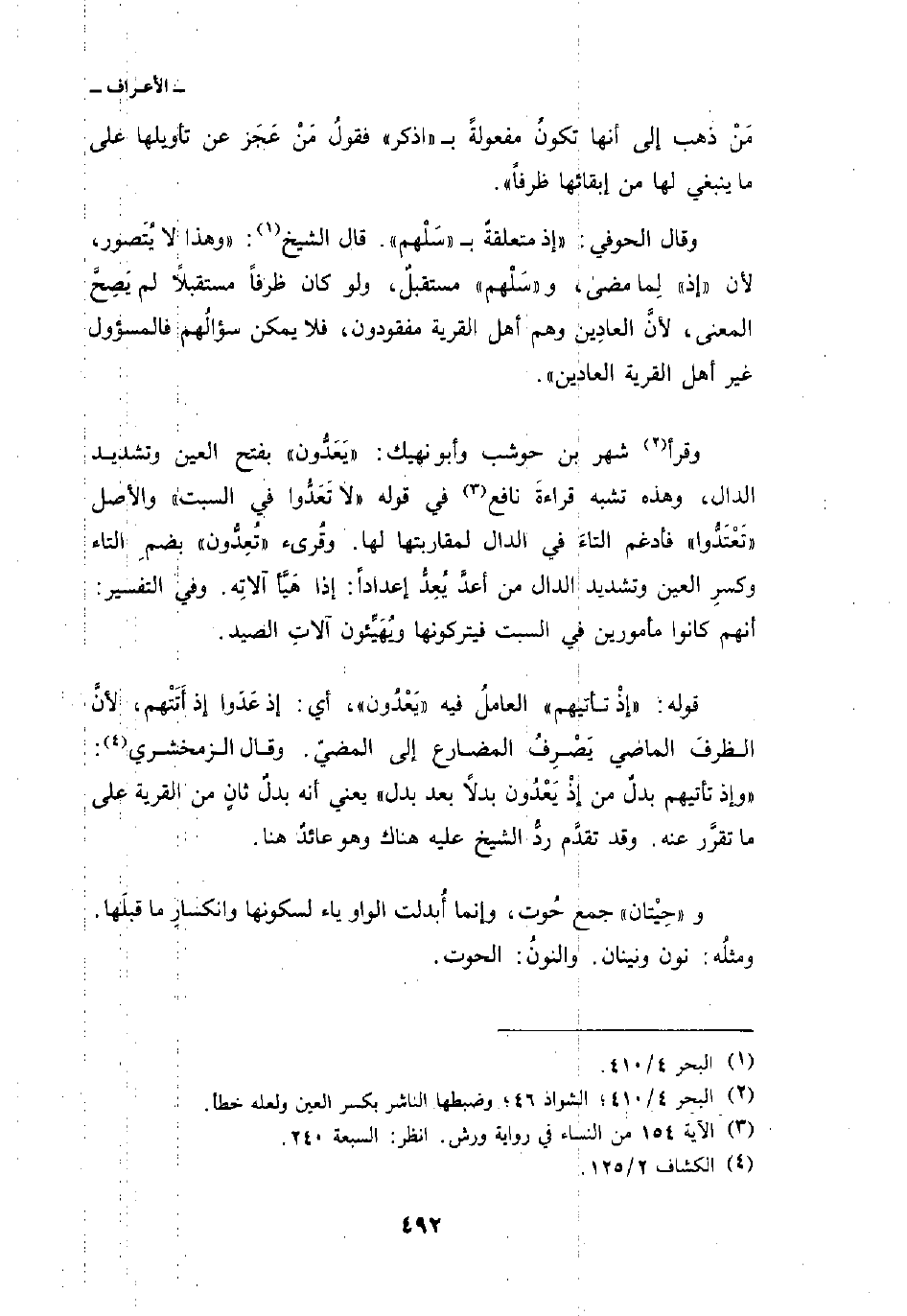 وقال الحوفي: «إذ متعلقةٌ ب» سَلْهم «. قال الشيخ:» وهذا لا يُتَصور، لأن «إذ» لِما مضى، و «سَلْهم» مستقبلٌ، ولو كان ظرفاً مستقبلاً لم يَصِحَّ المعنى، لأنَّ العادِين وهم أهل القرية مفقودون، فلا يمكن سؤالُهم فالمسؤول غير أهل القرية العادين «.