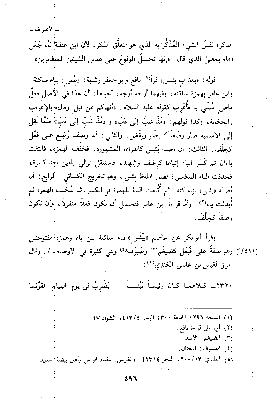 قوله: {بِعَذَابٍ بَئِيسٍ} قرأ نافع وأبو جعفر وشيبة: «بِيْسٍ» بياء ساكنة. وابن عامر بهمزة ساكنة، وفيهما أربعة أوجه، أحدها: أن هذا في الأصل فعلٌ ماضٍ سُمِّي به فأُعْرِب كقوله عليه السلام: «أنهاكم عن قيلٍ وقال» بالإِعراب والحكاية، وكذا قولهم: «مُذْ شَبَّ إلى دَبَّ» و «مُذْ شَبٍّ إلى دَبٍّ» فلمَّا نُقِل إلى الاسمية صار وَصْفاً ك نِضْو ونِقْض. والثاني: أنه وصف وُضِع على فِعْل كحِلْف. الثالث: أن أصلَه بَئيس كالقراءة المشهورة، فخفَّف الهمزة، فالتقت ياءان ثم كَسَر الباء إتباعاً كرِغيف وشِهيد، فاستثقل توالي ياءين بعد كسرة، فحذفت الياء المكسورة فصار اللفظ بِئْسٍ، وهو تخريج الكسائي. الرابع: أن أصله «بَئِس» بزنة كَتِف ثم أُتْبعت الباءُ للهمزة في الكسر، ثم سُكِّنت الهمزة ثم أُبدلت ياء. وأمَّا قراءةُ ابنِ عامر فتحتمل أن تكون فعلاً منقولاً، وأن تكون وصفاً كحِلْف.