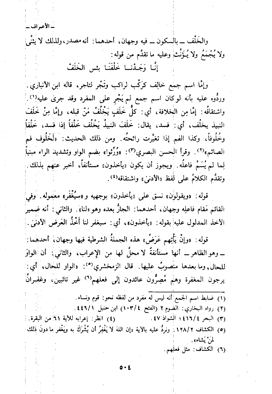 إنَّا وَجَدْنا خَلْفَنَا بئس الخَلَفْ ... وإمَّا اسم جمع خالِف كرَكْب لراكب وتَجْر لتاجر، قاله ابن الأنباري. وردُّوه عليه بأنه لو كان اسم جمع لم يَجْرِ على المفرد وقد جرى عليه. واشتقاقُه: إمَّا من الخلافة، أي: كلُّ خَلَفٍ يَخْلُفُ مَنْ قبله، وإمَّا مِنْ خَلَفَ النبيذ يخلُف، أي: فسد، يقال: خَلَفَ النبيذُ يَخْلُف خَلْفاً إذا فسد، خَلْفاً وخُلُوفاً، وكذا الفم إذا تغيَّرت رائحتُه. ومن ذلك الحديث:» لَخَلُوف فم الصائم «. وقرأ الحسن البصري:» وُرِّثوا «بضم الواو وتشديد الراء مبنياً لِما لم يُسَمَّ فاعلُه. ويجوز أن يكون» يأخذون «مستأنفاً، أخبر عنهم بذلك. وتقدَّم الكلامُ على لفظ» الأدنى «واشتقاقه.