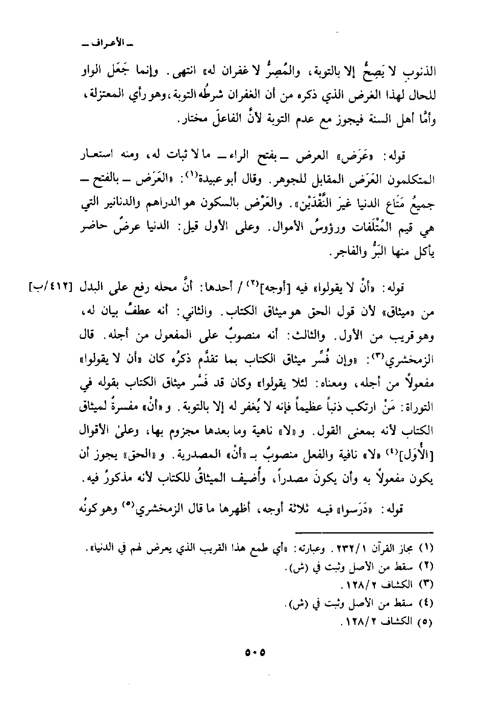 قوله: {أَن لاَّ يِقُولُواْ} فيه [أوجه] / أحدها: أنَّ محله رفع على البدل من «ميثاق» لأن قول الحق هو ميثاق الكتاب. والثاني: أنه عطفُ بيان له، وهو قريب من الأول. والثالث: أنه منصوبٌ على المفعول من أجله. قال الزمخشري: «وإن فُسِّر ميثاق الكتاب بما تقدَّم ذكرُه كان» أن لا يقولوا «مفعولاً من أجله، ومعناه: لئلا يقولوا» وكان قد فَسَّر ميثاق الكتاب بقوله في التوراة: مَنْ ارتكب ذنباً عظيماً فإنه لا يُغفر له إلا بالتوبة. و «أنْ» مفسرةٌ لميثاق الكتاب لأنه بمعنى القول. و «لا» ناهية وما بعدها مجزوم بها، وعلى الأقوال [الأُول] «لا» نافية والفعل منصوبٌ ب «أنْ» المصدرية. و «الحق» يجوز أن يكون مفعولاً به وأن يكونَ مصدراً، وأُضيف الميثاقُ للكتاب لأنه مذكورٌ فيه.