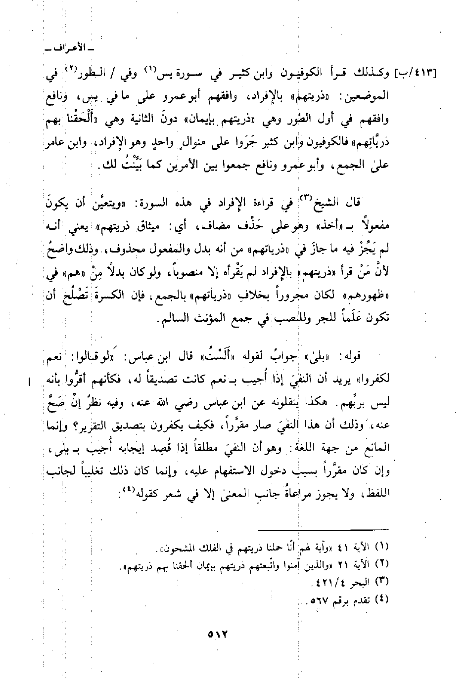 قال الشيخ في قراءة الإِفراد في هذه السورة:» ويتعيَّن أن يكونَ مفعولاً ب «أخذ» وهو على حَذْف مضاف، أي: ميثاق ذريتهم «يعني أنه لم يَجُزْ فيه ما جازَ في» ذرياتهم «من أنه بدل والمفعول محذوف، وذلك واضحٌ لأنَّ مَنْ قرأ» ذريتهم «بالإِفراد لم يَقْرأه إلا منصوباً، ولو كان بدلاً مِنْ» هم «في» ظهورهم «لكان مجروراً بخلافِ» ذرياتهم «بالجمع، فإن الكسرةَ تَصْلُح أن تكون عَلَماً للجر وللنصب في جمع المؤنث السالم.